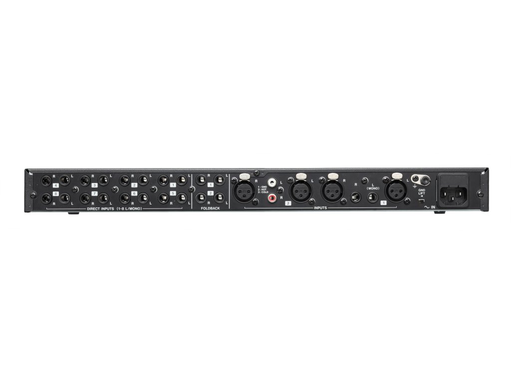 Każdy kanał modelu MH-8 jest wyposażony w potencjometr regulujący poziom wyjściowy wyjścia słuchawkowego, przycisk sumowania mono i trzy przyciski do wyboru źródła sygnału. Tascam MH-8 oferuje dwa główne wejścia stereo (dostępne złącza XLR i ¼“ Jack TRS przy pierwszym wejściu, XLR i RCA przy drugim), ale także możliwość podłączenia sygnału stereo bezpośrednio do każdego kanału (Direct input). Nie brakuje również tzw. Wyjść Foldback, czyli równoległych wyjść głównych wejść stereo, które można wykorzystać na przykład do łańcuchowego łączenia większej liczby wzmacniaczy słuchawkowych.