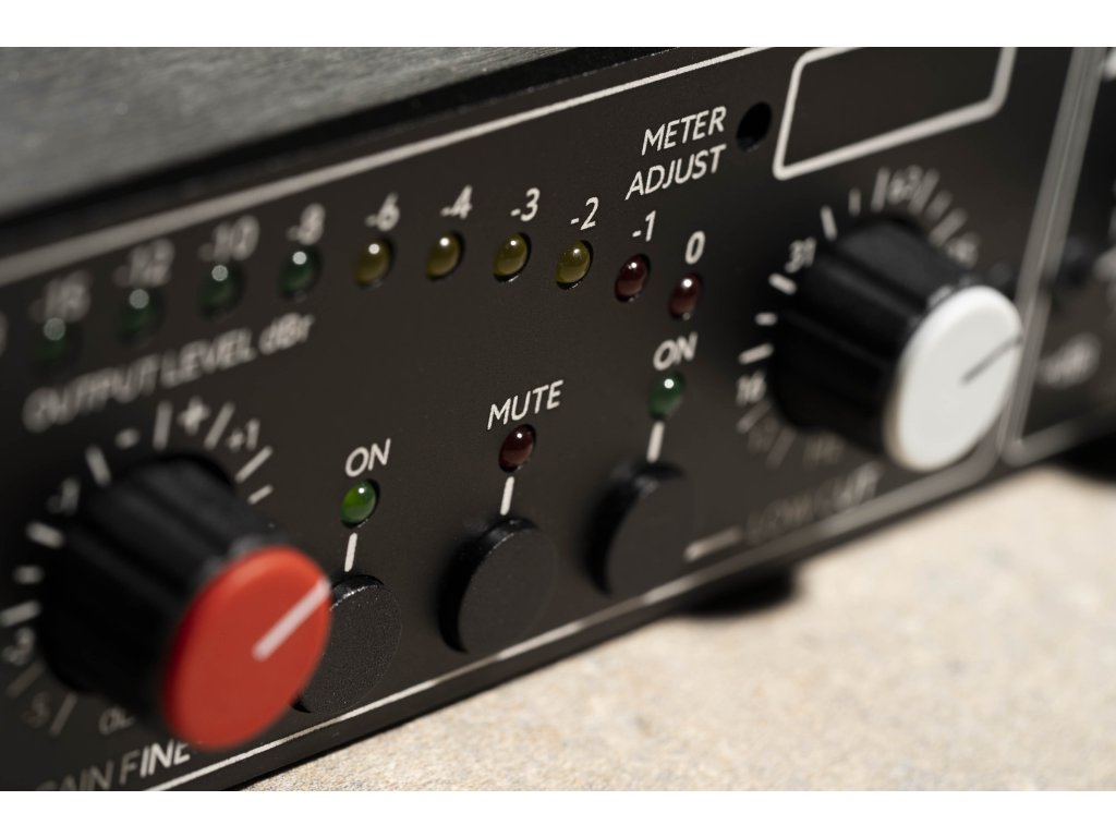 - Dodatkowe funkcje: Przedwzmacniacze klasy A, regulowany filtr Lo-Cut, przycisk tłumienia, zasilanie fantomowe 48V, odwrócenie fazy sygnału, 16-stopniowy miernik poziomu sygnału