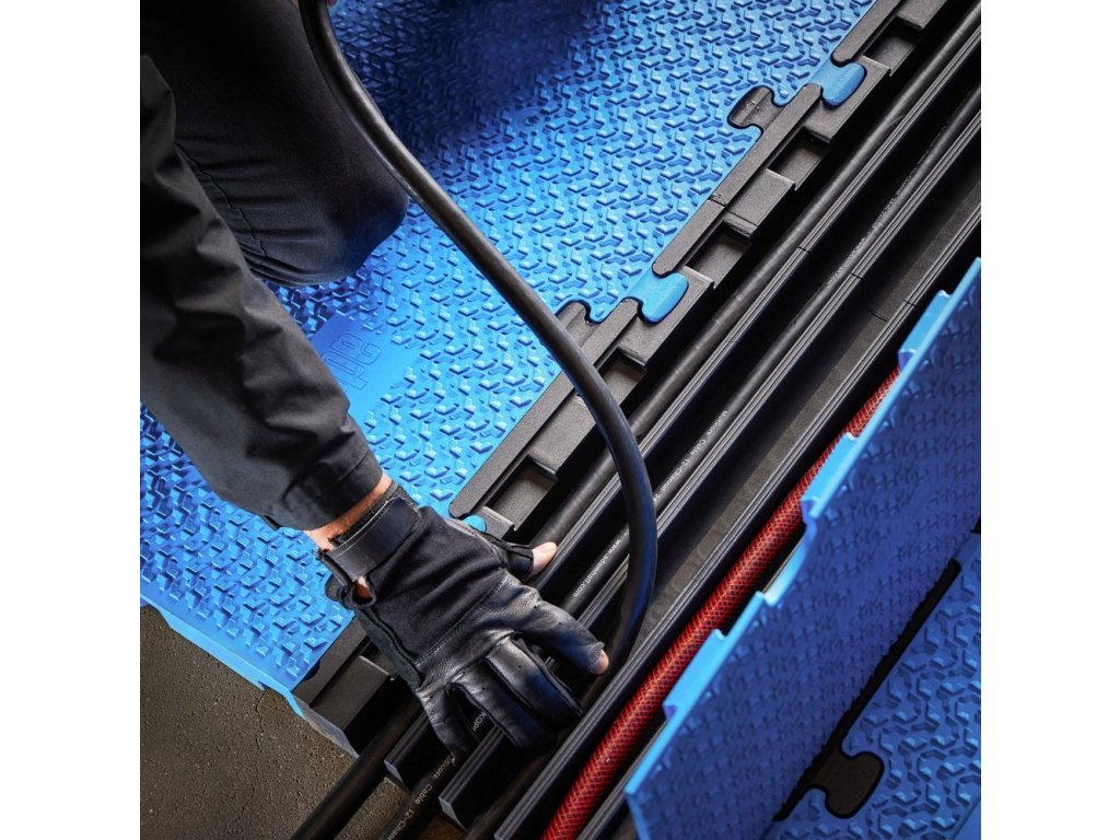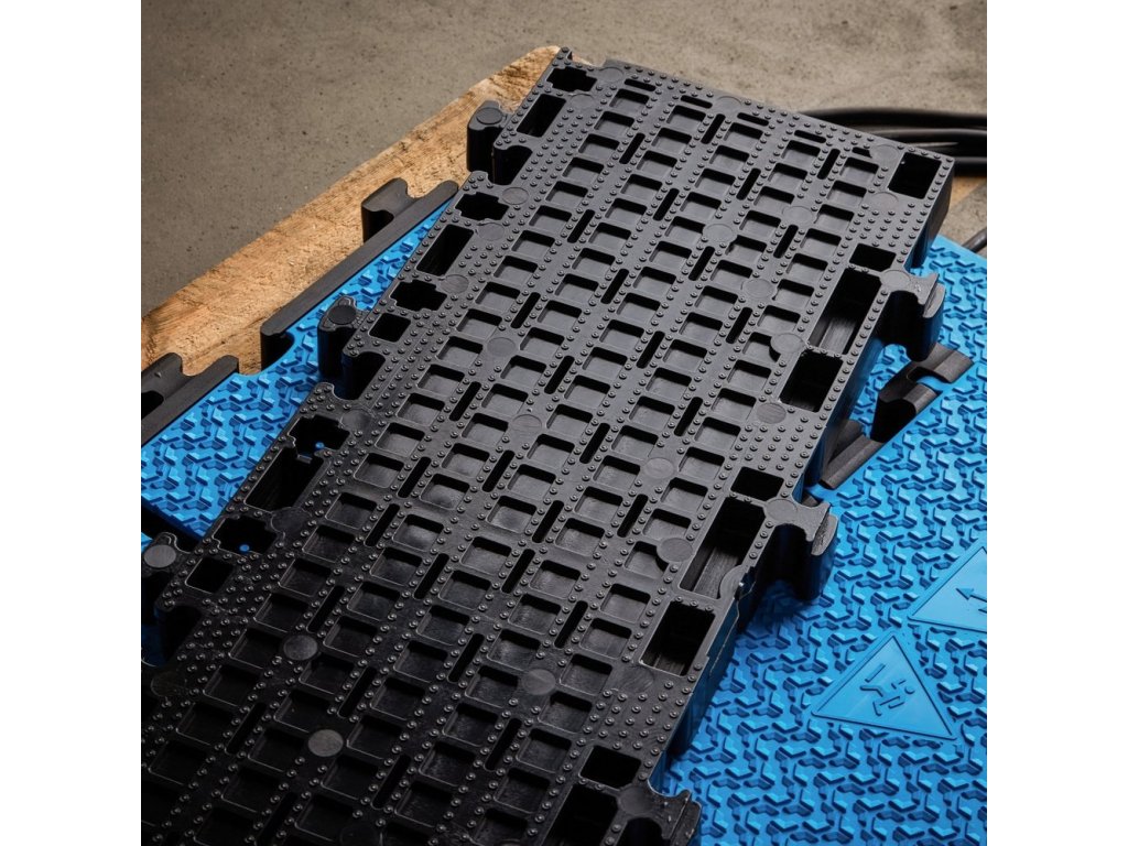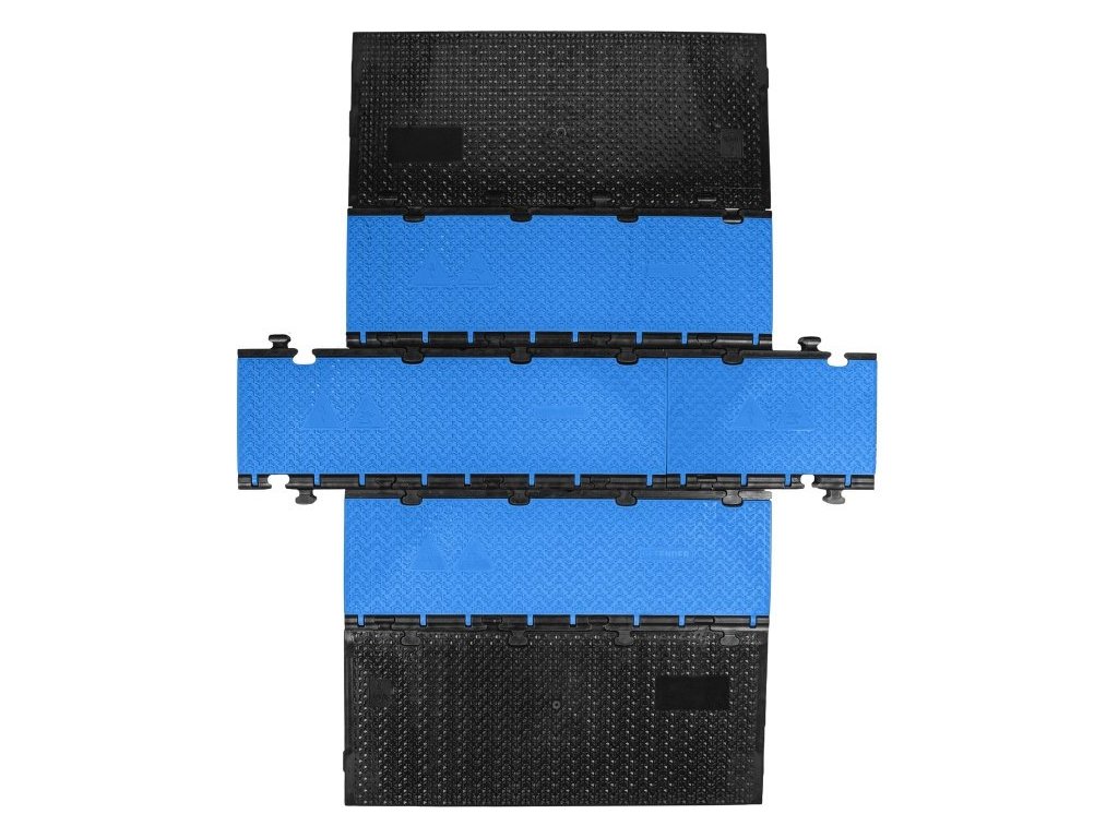 System można dowolnie rozszerzać na długość i szerokość. Łatwa dostępność i bezpieczeństwo są zatem gwarantowane również w obszarach, gdzie pięć kanałów nie wystarcza, w pobliżu generatorów energii lub FOH. Kable audio, oświetleniowe i zasilające można układać pojedynczo, bez wysiłku i bezpiecznie. Całkowicie symetryczna struktura części środkowych ułatwia montaż i już nigdy nie musisz szukać właściwego mocowania. Precyzyjne plany budowlane również nie są konieczne. Dzięki tej symetrii można osiągnąć optymalną stabilność w kierunku wzdłużnym i poprzecznym, układając środkowe części i najazdy w sposób półkompozytowy, a jednocześnie wyeliminować potrzebę stosowania luźnych części, takich jak adaptery i łączniki. Złącza zostały zaprojektowane tak, aby miały wystarczający luz dla łatwego montażu, a jednocześnie zapewniały wystarczającą stabilność. Jeśli przejazdy kablowe mają być układane bez ramp, dostępne są adaptery do podłączenia środkowych części w kierunku wzdłużnym.