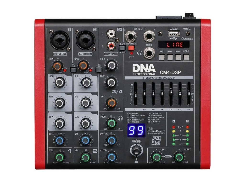 DNA CM4-DSP to kompaktowy 4-kanałowy mikser dźwięku USB z odtwarzaczem MP3 i bezprzewodowym standardem Bluetooth. Urządzenie jest wyposażone w procesor efektów cyfrowych oferujący 99 różnych modulacji dźwiękowych, graficzny korektor i zasilanie fantomowe + 48V, dzięki któremu możliwe jest dostarczanie stałego napięcia do niektórych urządzeń audio, instrumentów lub mikrofonów. To świetne rozwiązanie dla wokalistów, zespołów, mobilnych DJ-ów, ale także firm eventowych i różnego typu instytucji.