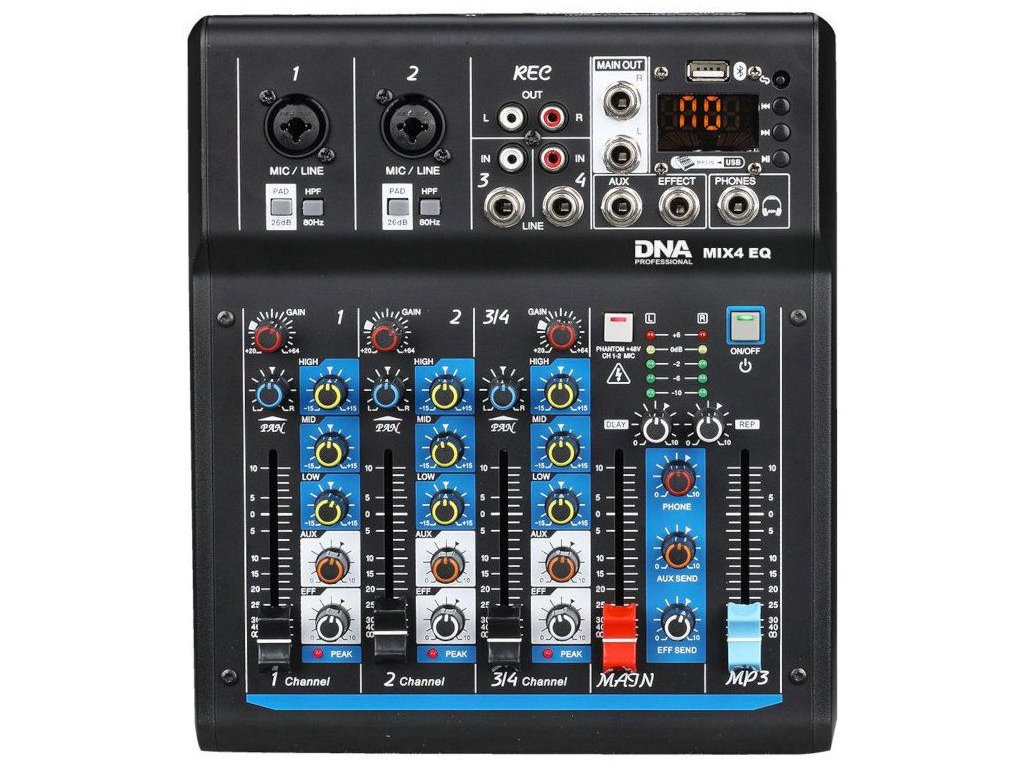 DNA MIX 4 EQ to lekki i bardzo mały analogowy mikser sceniczny wyposażony w port USB i obsługę plików MP3, bezprzewodowy system transmisji danych Bluetooth oraz zasilanie Phantom. Urządzenie obsługuje 4 kanały. Pierwsze dwa posiadają wejścia sygnałowe combo XLR/jack przeznaczone głównie do podłączania mikrofonów (Mic) i instrumentów (Line).