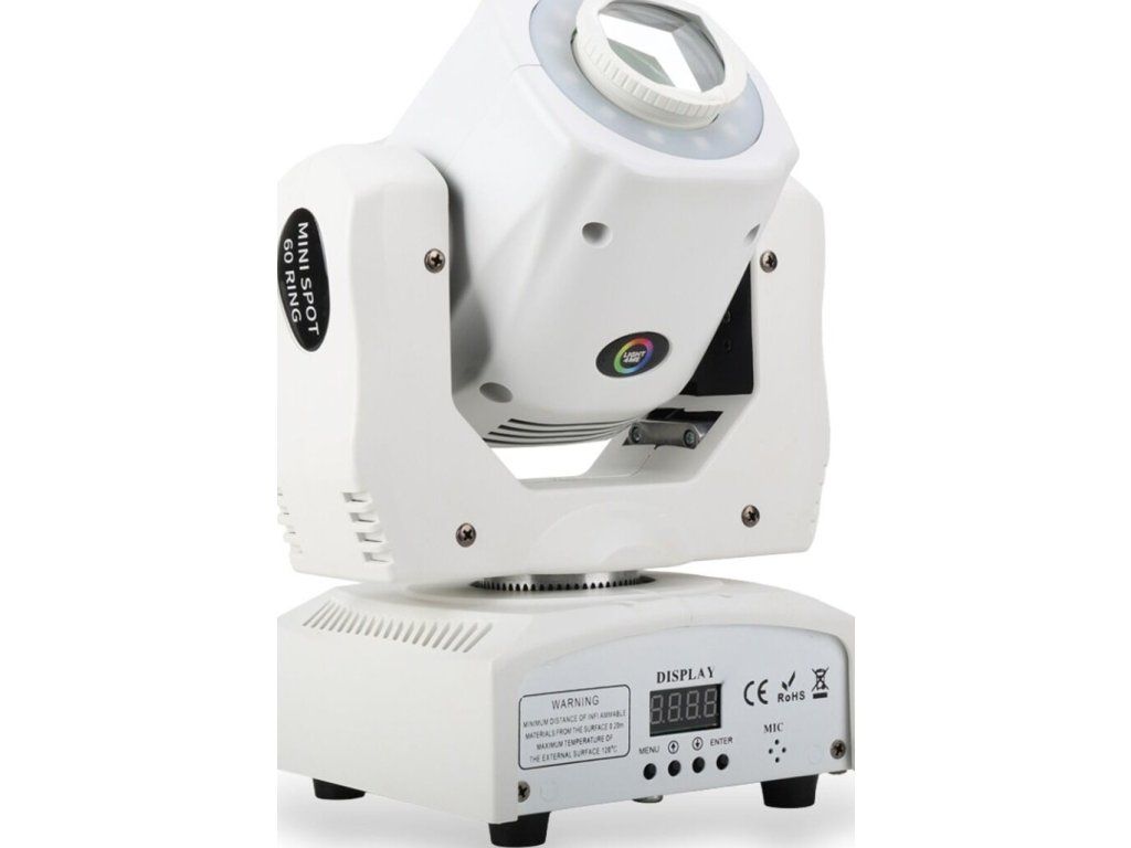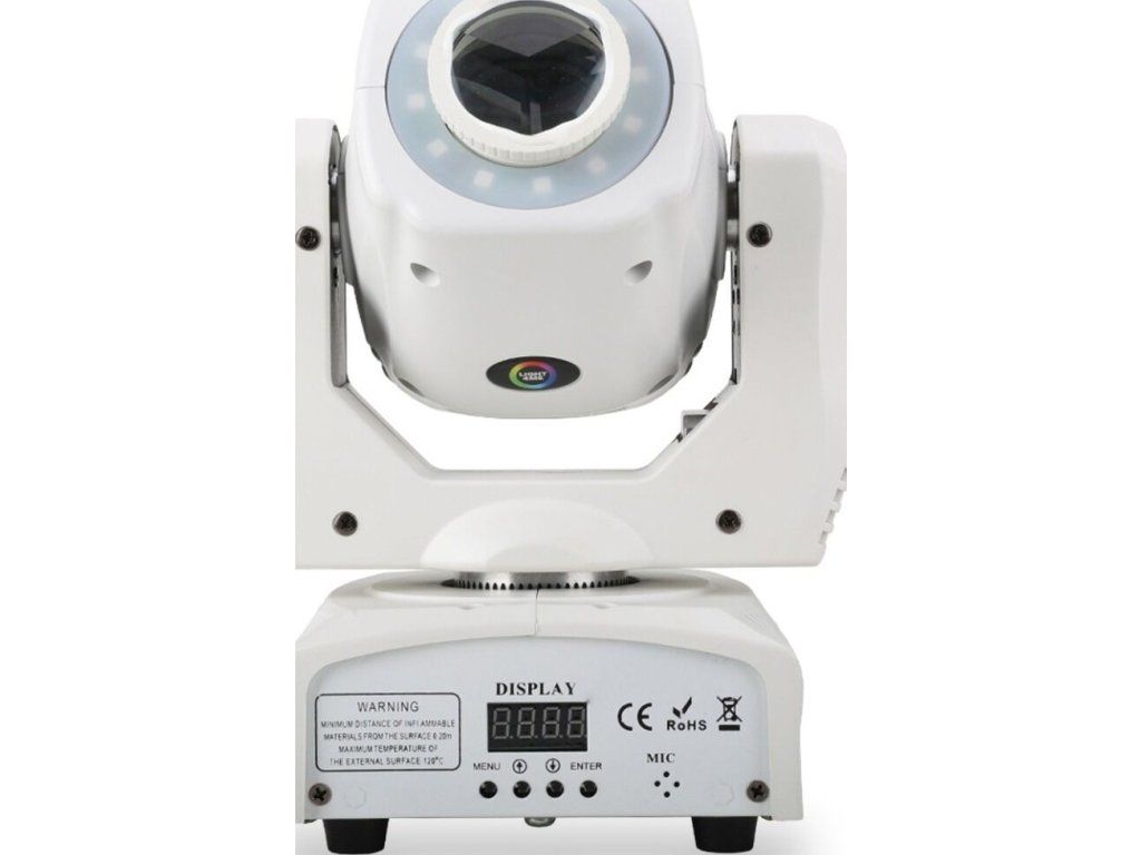 Pierścień LED RGB z 12 diodami dodaje kolorową poświatę wokół głównego strumienia światła. Dzięki temu jedna głowica może jednocześnie tworzyć punktowy efekt spot i kolorowe tło, co szczególnie sprawdza się w małych instalacjach DJ-skich.