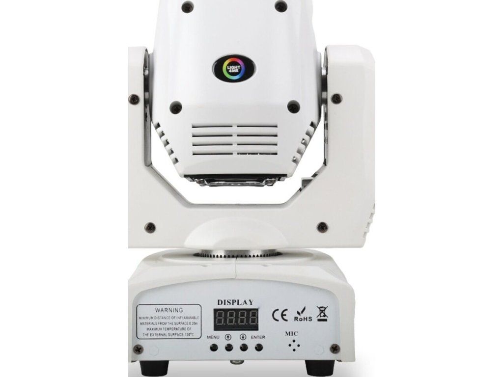 Light4Me Mini Spot 60 Ring WH można uruchomić bez kontrolera DMX, korzystając z trybu automatycznego lub sterowania pilotem na podczerwień (IR). Wystarczy umieścić urządzenie na statywie lub konstrukcji i wybrać jeden z gotowych programów.