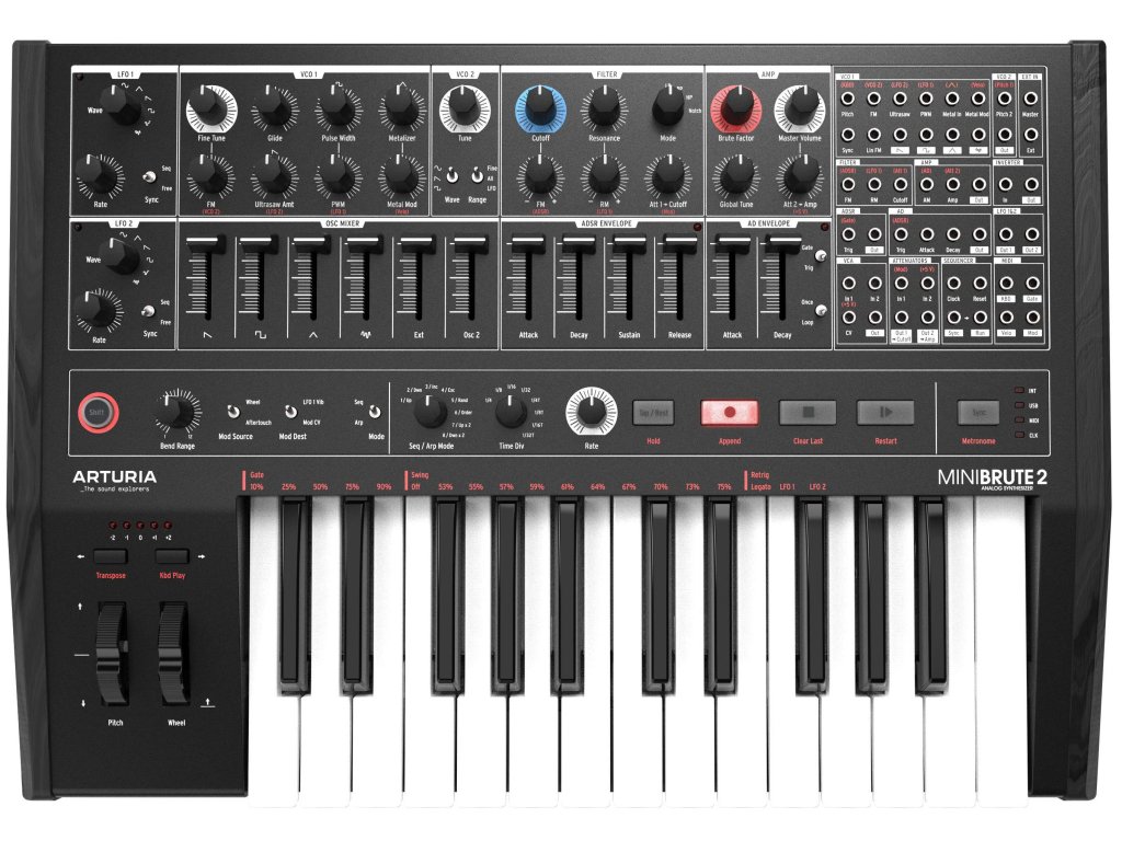 Popularny syntezator analogowy Arturia Minibrute w swojej drugiej wersji oferuje drugi oscylator, drugie LFO, nowe możliwości modulacji filtra i VCO, zapętlaną obwiednię, a przede wszystkim masywny patchbay, dzięki któremu dźwięk można znacznie modulować zarówno w ramach Minibrute 2, jak i za pomocą zewnętrznych źródeł. Nie brakuje wbudowanego sekwencera, arpeggiatora, klawiatury z aftertouch oraz MIDI i USB do połączenia z DAW. Minibrute 2 swoją funkcjonalnością przypomina szwajcarski nóż i potrafi być równie ostry.