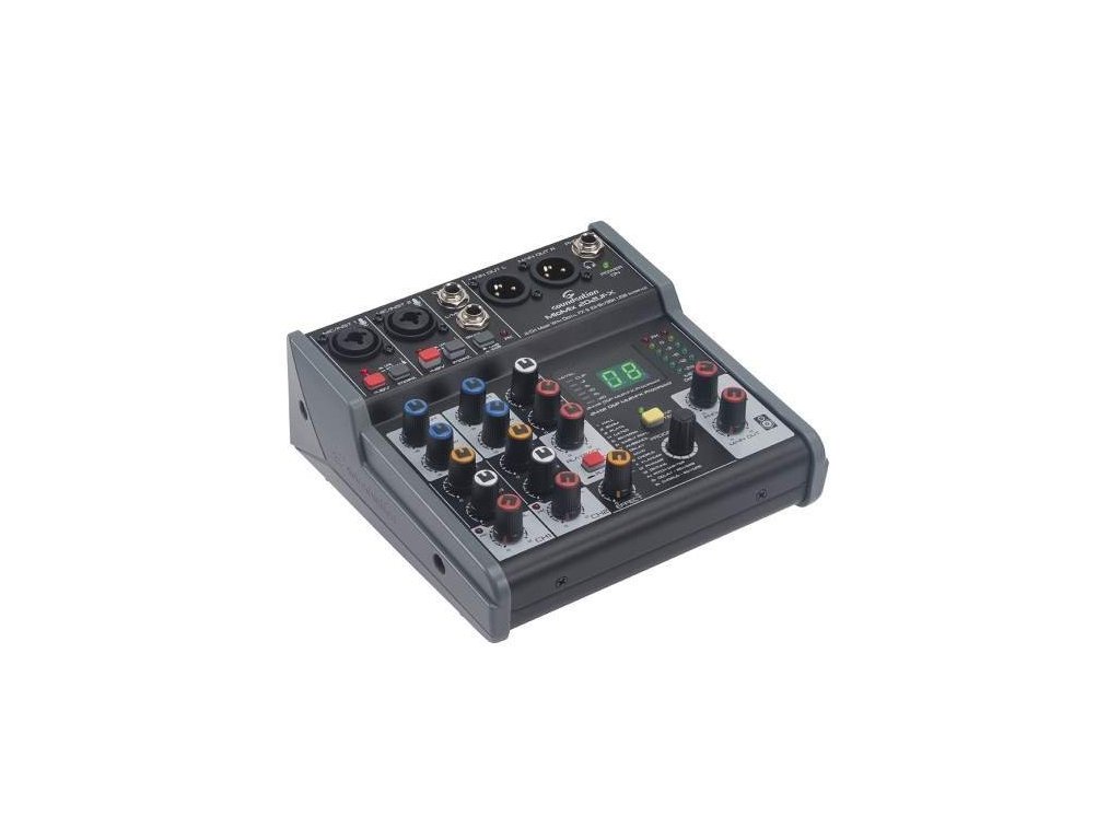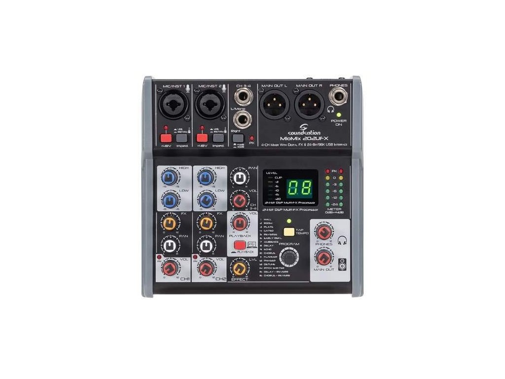 Miomix 202UFX to czterokanałowy mikser z dwoma wejściami kombi XLR/TRS, dwoma wejściami liniowymi, dwoma wyjściami XLR do PA, wyjściem słuchawkowym do szczegółowego monitoringu oraz portem USB do podłączenia do komputera PC lub laptopa. Sygnał wyjściowy można następnie regulować za pomocą dwupasmowego korektora lub jednego z szesnastu efektów (Hall/Room/Plate Reverb/Delay/Echo/Chorus itp.). Zintegrowana karta dźwiękowa oferuje transmisję sygnału audio w jakości do 24bit/96kHz. Podgląd ustawień uzyskasz za pomocą sześciopoziomowego wskaźnika LED i podświetlanego wyświetlacza.