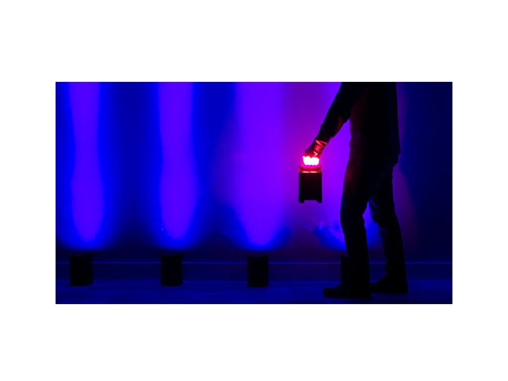 ADJ Lighting Mirage Q6 Pak Black to uniwersalny system oświetleniowy składający się z sześciu lamp ze stopniem ochrony IP65, przeznaczony do użytku na zewnątrz i wewnątrz pomieszczeń. Oprawy oświetleniowe są zasilane bateryjnie i dostarczane w wytrzymałej walizce transportowej ze zintegrowanym rozwiązaniem do ładowania baterii.