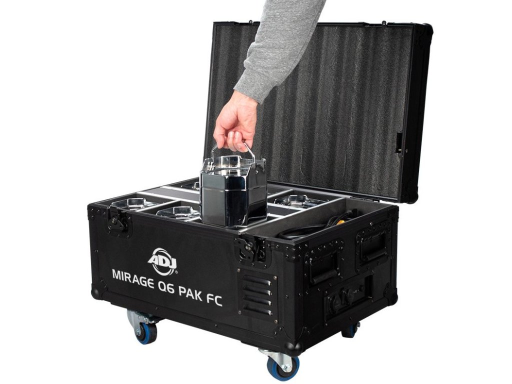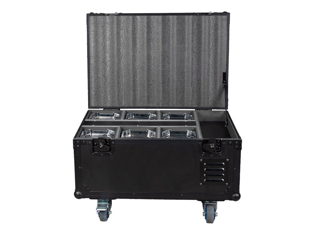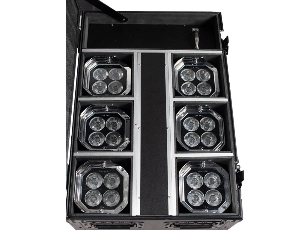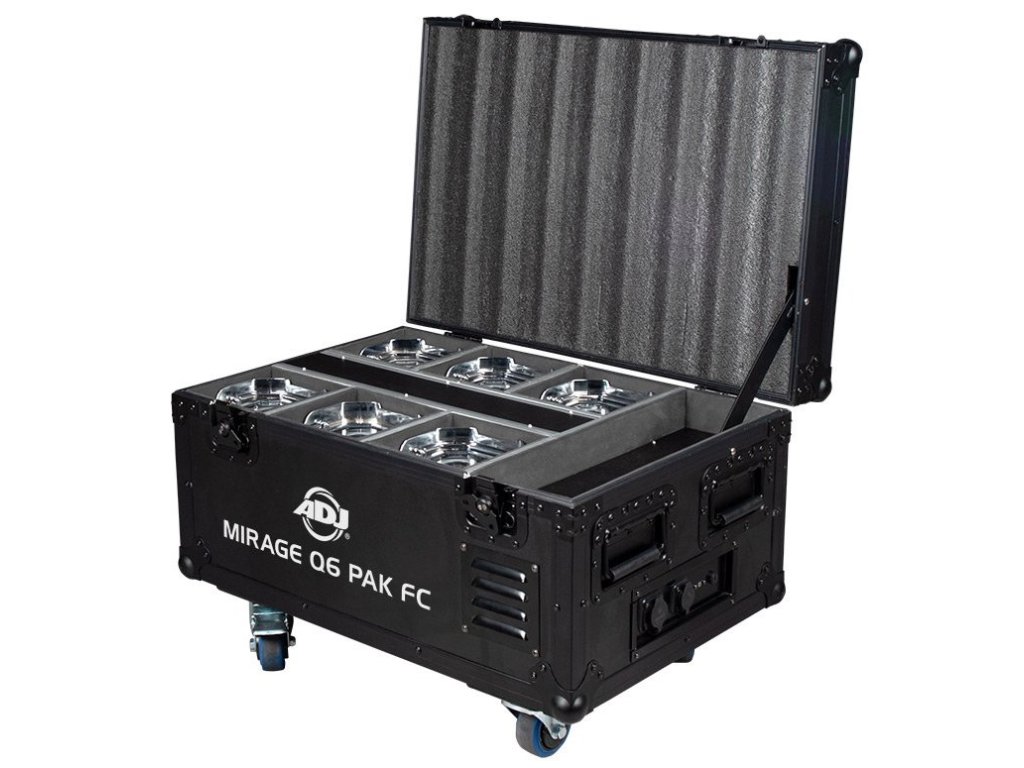 ADJ Lighting Mirage Q6 PAK to kompleksowy system oświetleniowy typu "wszystko w jednym", składający się z sześciu lamp zasilanych bateryjnie o stopniu ochrony IP65 oraz wytrzymałej walizki transportowej z funkcją ładowania baterii.