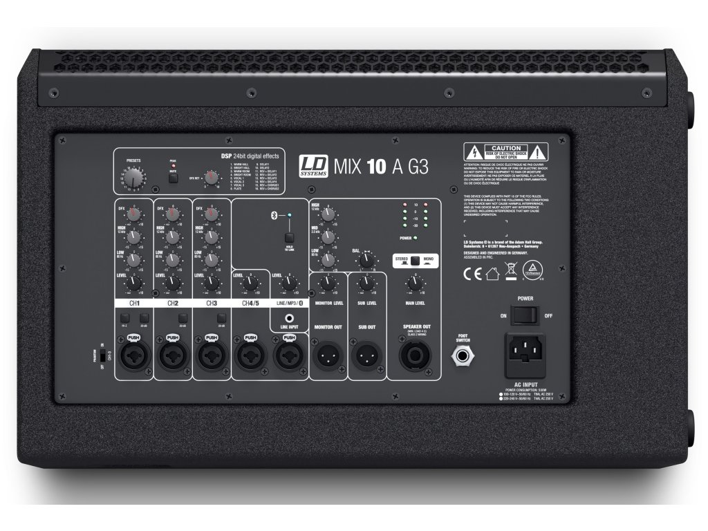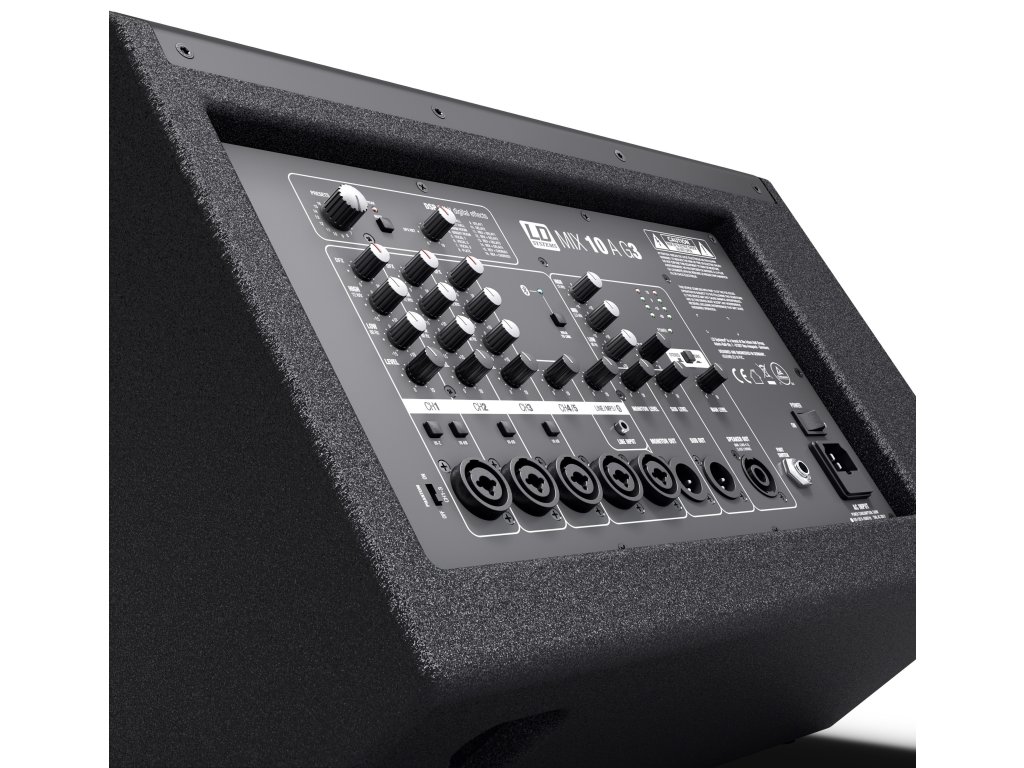 Idealny wybór dla małych zespołów i osobistych aplikacji monitorujących. Aktywny LD MIX 10 A G3 posiada 7-kanałowy mikser i wzmacniacz klasy D o mocy szczytowej 2x 400 watów. Kompaktowy głośnik jest wyposażony w 10 " głośnik niskotonowy i 1" głośnik wysokotonowy oraz pasmo przenoszenia od 65 Hz do 20 kHz.