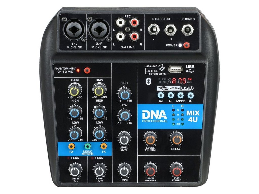 DNA MIX 4U to lekki i bardzo mały analogowy mikser, który obsługuje standard bezprzewodowej komunikacji Bluetooth, jest wyposażony w port USB, obsługę MP3 i zasilanie phantom + 48 V. Urządzenie obsługuje 4 kanały. Posiada 2 kombinowane wejścia XLR / jack, które dzięki specjalnemu przełącznikowi mogą pracować w trybie mono lub jako jeden kanał stereo, oraz stereofoniczne złącze RCA (cinch) dla kanałów 3 i 4. Użytkownik może kontrolować głośność dla każdego kanału, użyć 2-pasmowego korektora wysokich i niskich tonów oraz wzmocnienia sygnału na wejściach 1 i 2. Ponadto mikser dźwięku ma wbudowany efekt opóźnienia, którego częstotliwość i poziom nakładania się na danym kanale można łatwo kontrolować. Sygnał wyjściowy można przesłać do głośników lub monitorować na słuchawkach. Najmocniejszą stroną tego miksera dźwięku jest port USB z wbudowanym odtwarzaczem MP3, który umożliwia podłączenie do konsoli notebooka, zewnętrznych kart pamięci lub innych urządzeń, które przesyłają sygnał dźwiękowy.