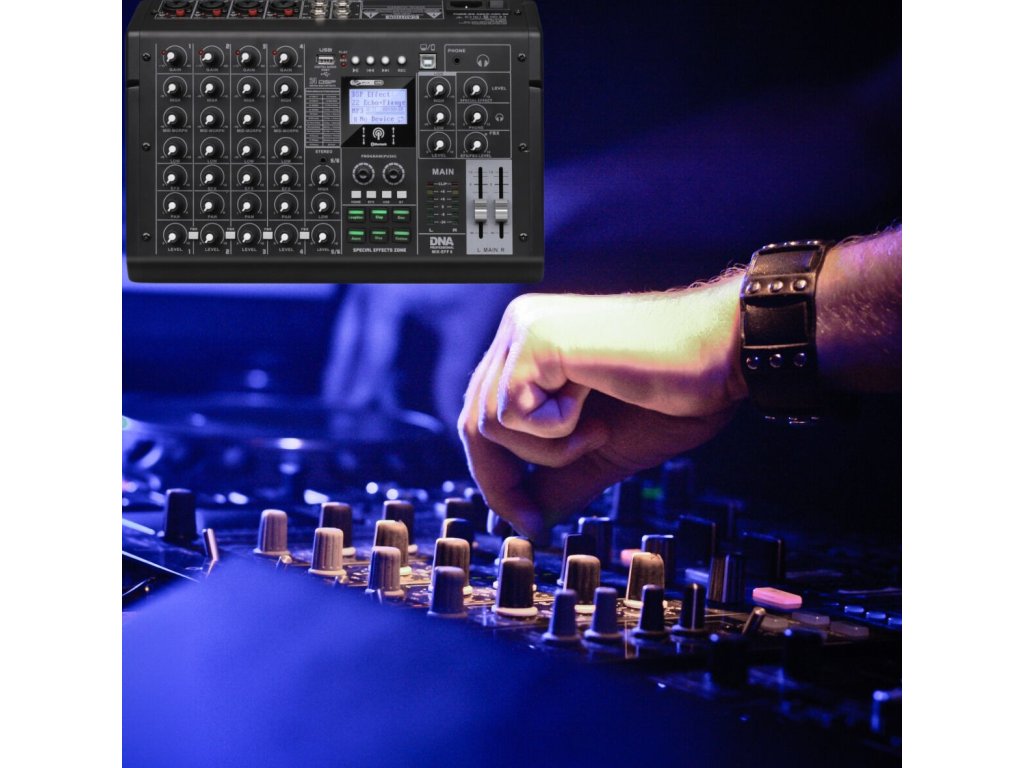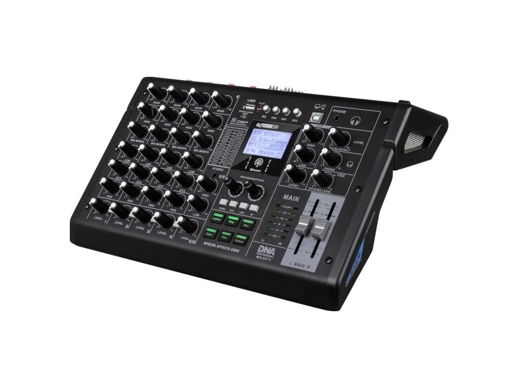 DNA MIX-EFF 6 to kompaktowy, a zarazem wielofunkcyjny analogowy mikser audio, który sprawdzi się w każdej sytuacji wymagającej niezawodnego przetwarzania dźwięku. Posiada 6 kanałów oraz cztery symetryczne wejścia combo XLR/jack 6,35 mm, dwa wejścia jack 6,35 mm, wejście stereo jack 3,5 mm, dwa wyjścia jack 6,35 mm oraz wyjście słuchawkowe jack 3,5 mm, co pozwala na elastyczne podłączenie mikrofonów, instrumentów i innych zewnętrznych urządzeń audio. Wbudowany odtwarzacz plików audio – wykorzystujący porty USB-A na zewnętrzne pamięci i USB-B do połączenia z komputerem lub smartfonem – oraz standard łączności bezprzewodowej bluetooth umożliwiają szybkie odtwarzanie i nagrywanie dźwięku bez zbędnego okablowania. DNA MIX-EFF 6 to idealne rozwiązanie dla DJ-ów, domowych studiów nagrań, sal prób, a także organizatorów wydarzeń na żywo.