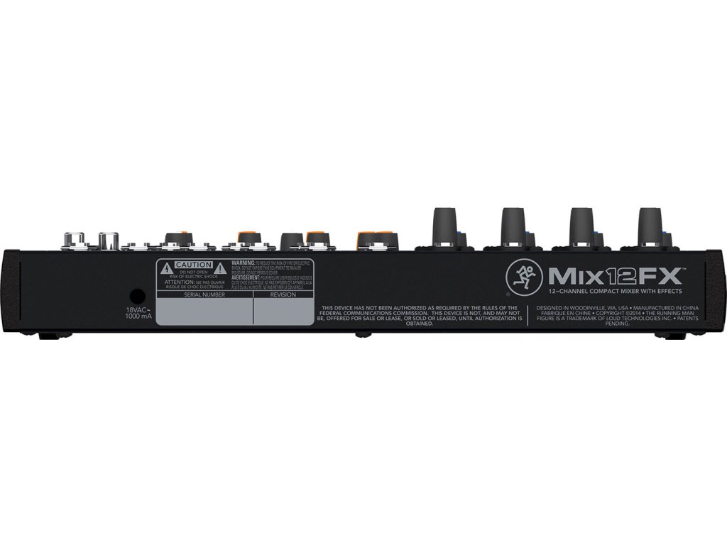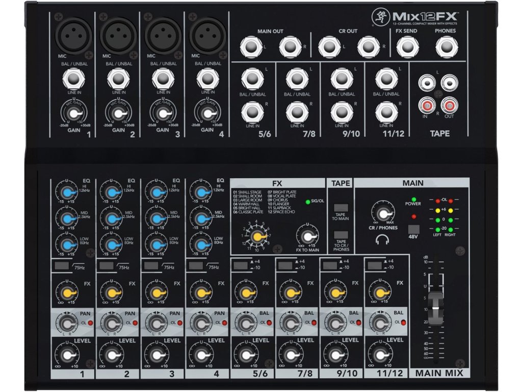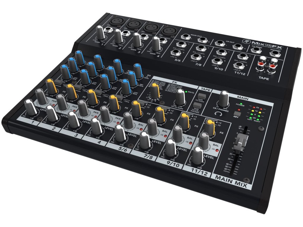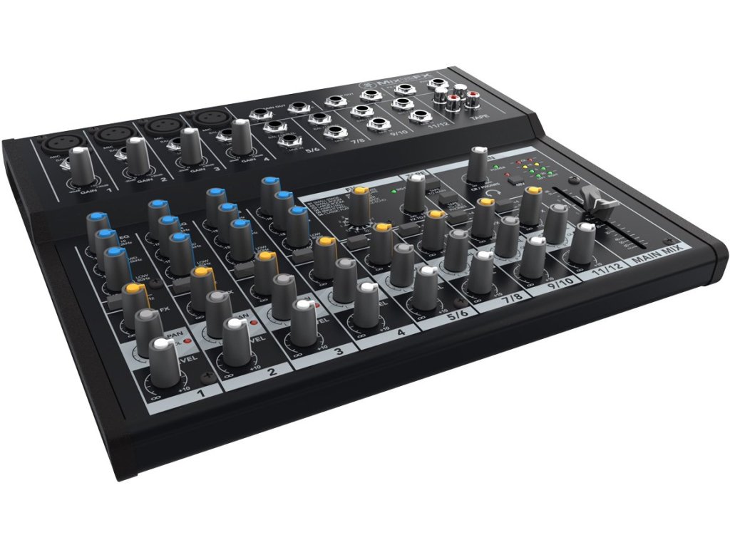 Mackie – Mix12FX to 12-kanałowy kompaktowy mikser z efektami. Wyposażony w stereofoniczne wejścia/wyjścia RCA do odtwarzania i nagrywania, 4 wejścia mikrofonowo-liniowe o studyjnej jakości, 4 stereofoniczne wejścia liniowe, 3-pasmowy korektor, wysyłkę aux ze stereofonicznymi powrotami 1/4”, 12 zintegrowanych efektów, w tym reverb, chorus, delay, wskaźniki Pan, Level i overload, zasilanie phantom, 60mm suwak dla głównych wyjść L/R. Kompaktowa i przenośna konstrukcja oraz solidna budowa.