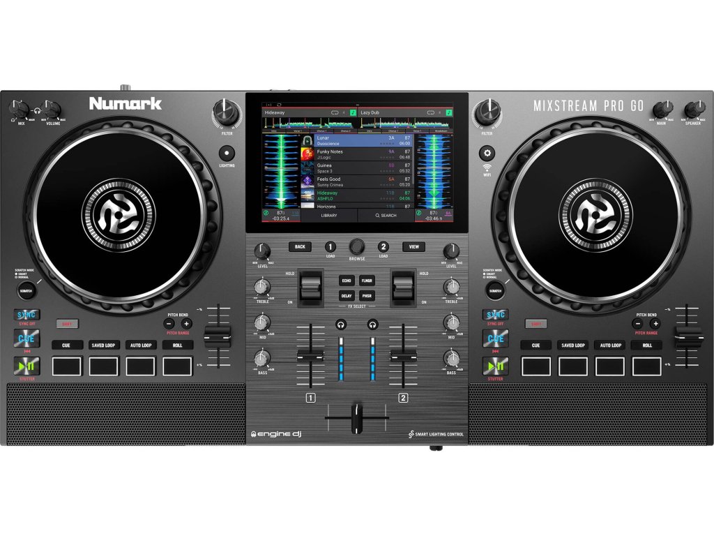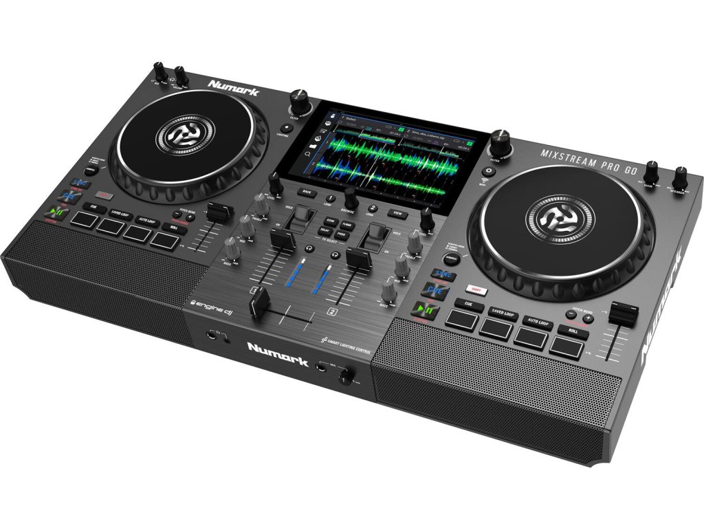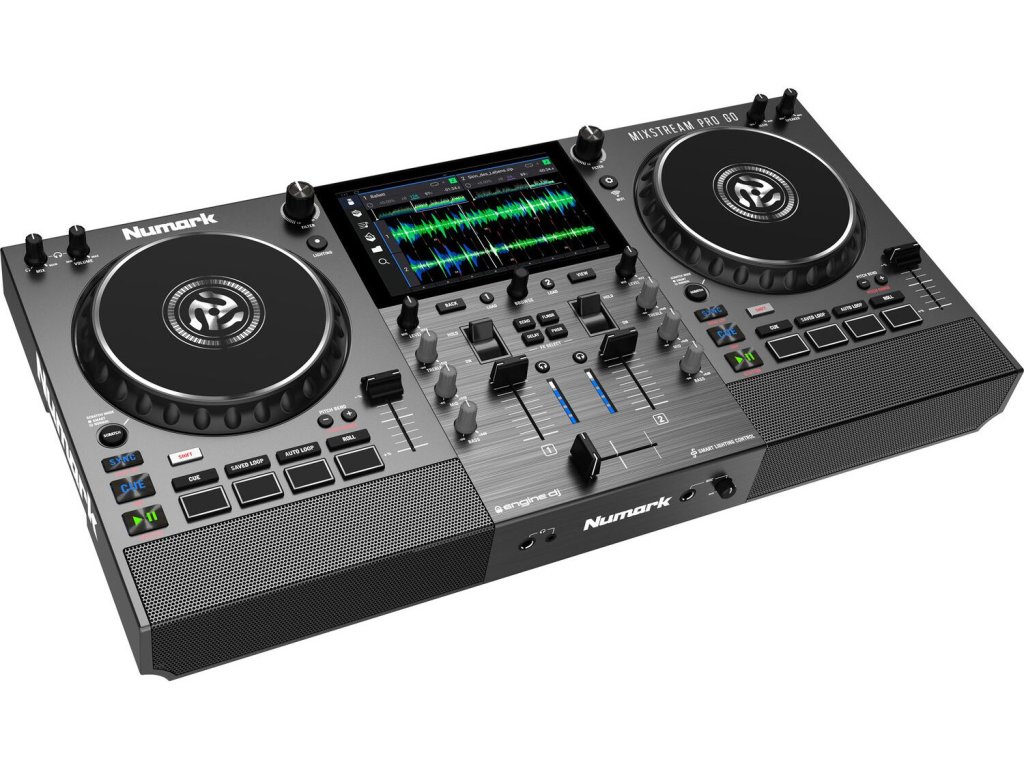 Numark Mixstream PRO GO to w pełni funkcjonalny samodzielny system DJ - kompletne rozwiązanie dla DJ-ów poszukujących profesjonalnego narzędzia all-in-one. Może również działać jako kontroler DJ dla Serato DJ i Virtual DJ z komputerem. Oferuje kompletny mikser z dwoma deckami, jednostkę efektów FX, 7-calowy multidotykowy wyświetlacz LCD, specjalnie opracowany system operacyjny Engine DJ, wewnętrzne głośniki i możliwość streamingu online. Usługi streamingowe można wykorzystywać przez Wi-Fi. Integralną częścią jest zautomatyzowany system sterowania pokazem świetlnym! Wbudowane akumulatory umożliwiają występy trwające kilka godzin.