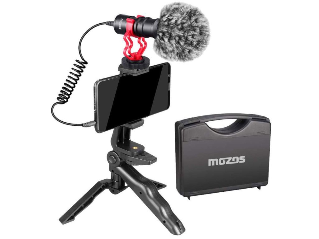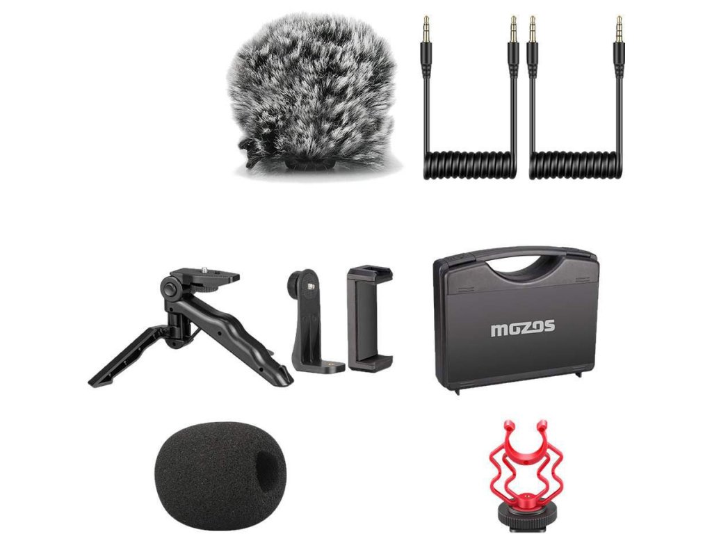 - Zawartość opakowania: Mikrofon, statyw trójnożny, uchwyt na telefon, uchwyt mikrofonowy, 2x osłona przeciwwietrzna, 2x kabel audio, walizka