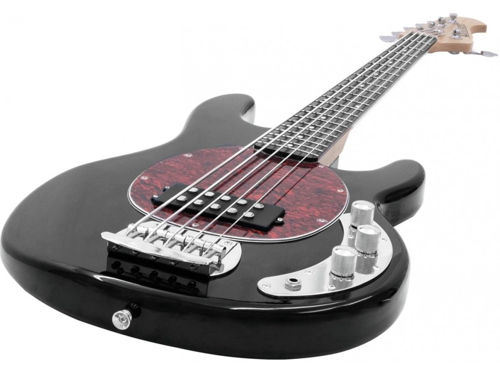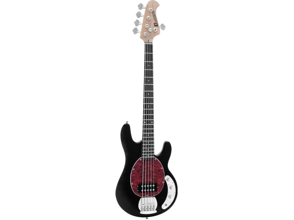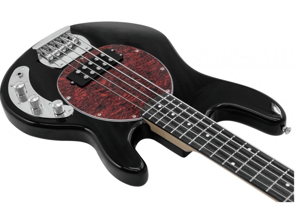 Elektryczna gitara basowa pięciostrunowa typu Music Man. Korpus lipowy, płytka maskująca z tworzywa imitującego skorupę żółwia, przykręcana szyjka klonowa, menzura 864 mm, podstrunnica blackwood, 21 progów, chromowane mechaniki, 1x przetwornik dwucewkowy (Humbucker), 2x regulacja głośności, 1x regulacja barwy dźwięku. Kolor czarny błyszczący.