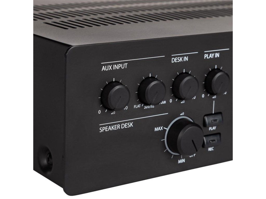- Dodatkowe uniwersalne wejście na XLR i odłączane zaciski śrubowe do mikrofonu mównicy lub mikrofonu do rozmów lub innych źródeł z regulacją głośności i korektorem dźwięku.