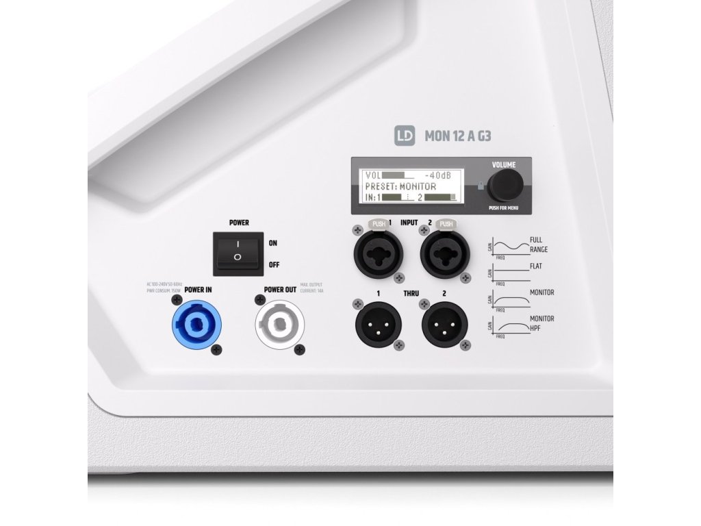 MON 12 A G3 W jest częścią nowo opracowanej serii zasilanych monitorów scenicznych o wysokiej wydajności. Seria MON G3 zawiera zaawansowane technologie i najwyższej klasy materiały, które można znaleźć w monitorach z najwyższej półki, zwykle wynajmowanych przez profesjonalistów, i udostępnia tę jakość każdemu. Należą do nich na przykład zaawansowane głośniki koncentryczne z zintegrowanym tubą CD 50° x 90°, które zapewniają akustyczny ideał prawdziwego źródła punktowego, a tym samym doskonałe właściwości dźwiękowe nawet z krótkich odległości odsłuchowych. Ponadto seria ta oferuje wysoki poziom wytrzymałości, rozbudowany zestaw funkcji i elegancki wygląd LD Systems. Monitory sceniczne 12"/1" od dziesięcioleci są złotym środkiem, jeśli chodzi o brzmienie, ciśnienie akustyczne i przenośność. Dzięki koncentrycznej konstrukcji, inteligentnej elektronice i profesjonalnemu wyglądowi MON 12 A G3 W przenosi tę koncepcję w "nowoczesność". Idealna geometria dyspersji 50° x 90° do zastosowania jako monitor lub 90° x 50° do zastosowania w FOH czyni go wszechstronnym talentem, który oferuje odpowiednie rozwiązanie dla niezliczonych różnych zadań. Zarówno sygnał (XLR/jack combo), jak i podłączenie zasilania (kompatybilne z PowerCON) można połączyć pętlą. Umożliwia to eleganckie i schludne okablowanie w konfiguracjach z wieloma monitorami lub do rozproszonego nagłośnienia.