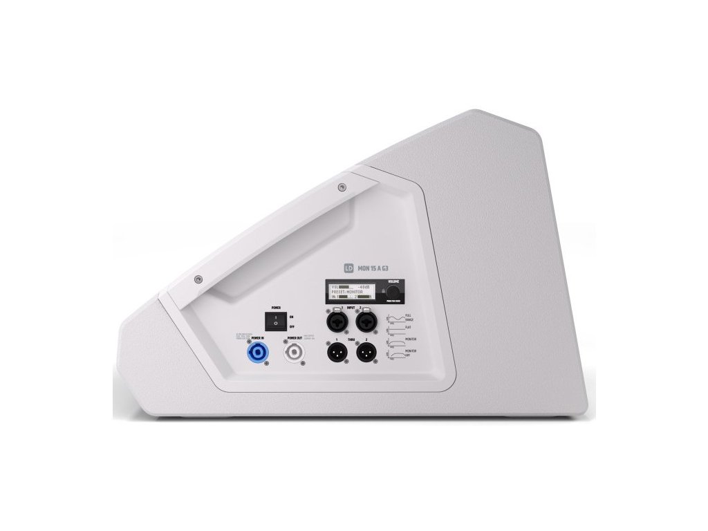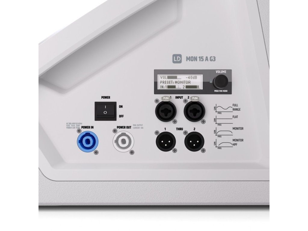MON 15 A G3 W jest częścią nowo opracowanej serii aktywnych monitorów scenicznych o wysokiej wydajności. Seria MON G3 zawiera zaawansowane technologie i najwyższej klasy materiały, które można znaleźć w monitorach z najwyższej półki, zwykle wynajmowanych przez profesjonalistów, i udostępnia tę jakość każdemu. Należą do nich na przykład zaawansowane głośniki koncentryczne z zintegrowanym tubą CD 50° x 90°, które zapewniają akustyczny ideał prawdziwego źródła punktowego, a tym samym doskonałe właściwości dźwiękowe nawet z krótkich odległości odsłuchowych. Ponadto seria ta oferuje wysoki poziom wytrzymałości, rozbudowany zestaw funkcji i elegancki design LD Systems. Maksymalny poziom ciśnienia akustycznego 129 dB i doskonała reprodukcja basów sprawiają, że MON 15 A G3 W jest najlepszym wyborem na głośne sceny zespołów, jako wypełnienie perkusji lub do samodzielnego użytku jako kompaktowy przedni system PA bez dodatkowego subwoofera. Jak na 15" monitor sceniczny jest niezwykle kompaktowy i elegancki, dzięki czemu pomimo imponujących parametrów wydajności harmonijnie wpasowuje się w konfigurację sceniczną. Sygnał (combo XLR/jack) i złącze zasilania (kompatybilne z PowerCON) można połączyć pętlą. Umożliwia to eleganckie i schludne okablowanie w konfiguracjach z wieloma monitorami lub do rozproszonego nagłośnienia.