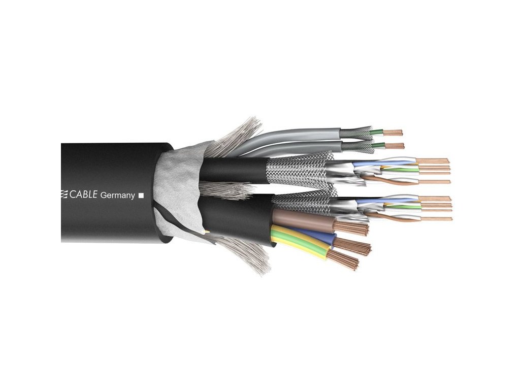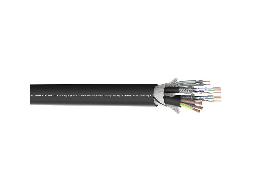MONOCAT POWER 212 integruje 2 x kabel danych CAT.7, 2 x kabel DMX i 1 x kabel zasilający 3 x 2,5 mm. Kabel nadaje się do zastosowań mobilnych i instalacyjnych. Wewnętrzna struktura CAT.7 2 x 4 x 2 x 0,14 mm ze spiralnym ekranowaniem z miedzi cynowanej + folia AL/PT, wewnętrzna struktura DMX 2 x 2 x 0,25 mm 110 Ohm ze spiralnym ekranowaniem z miedzi cynowanej, wewnętrzna struktura POWER 3 x 2,5 mm z cienkich drucików miedzianych. Całkowite ekranowanie 100%, maksymalna długość jednego przewodu to 100 m, zakres temperatur użytkowania -20° C do +75° C, zastosowano wysokiej jakości miedź OFC, przewody są umieszczone w powłoce PVC o całkowitej średnicy 21,8 mm, waga 1 m 470 g, kolor czarny.