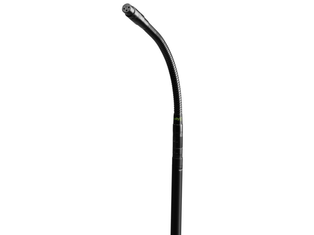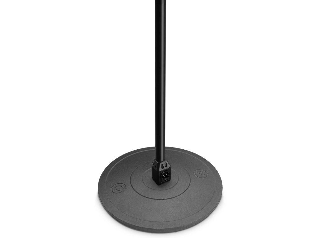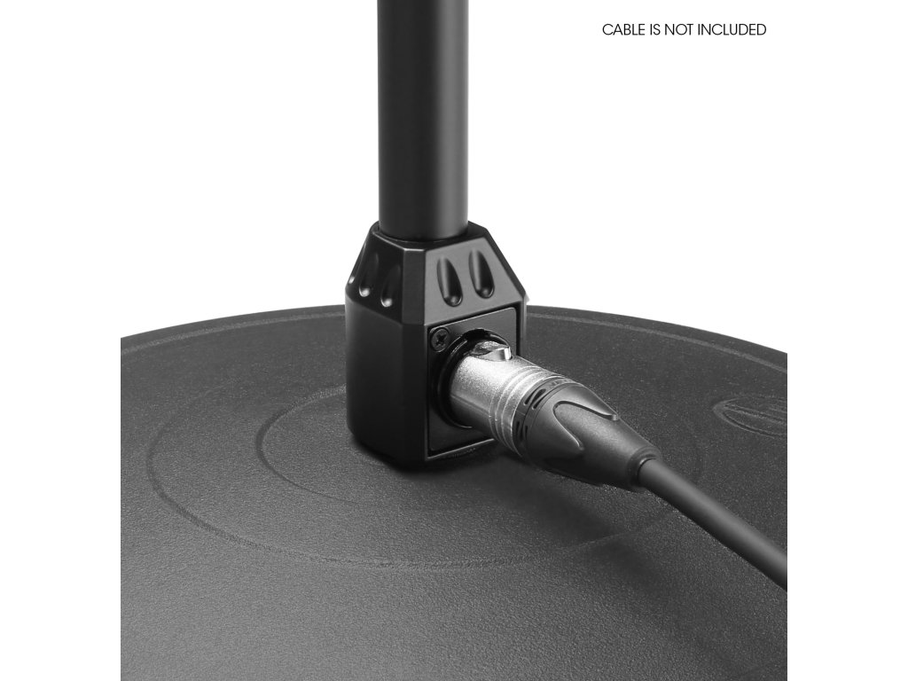 c Statyw wykonany jest z żelaza, dzięki wejściu XLR na spodzie możesz poprowadzić kabel aż do statywu, nie musisz go jednak skomplikowanie owijać wokół mikrofonu. Do statywu można przymocować dowolną gęsią szyję lub mikrofon z wejściem XLR.
