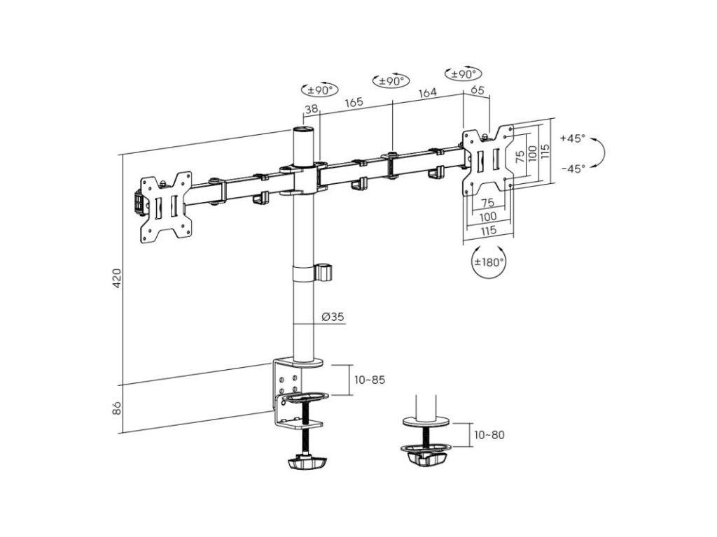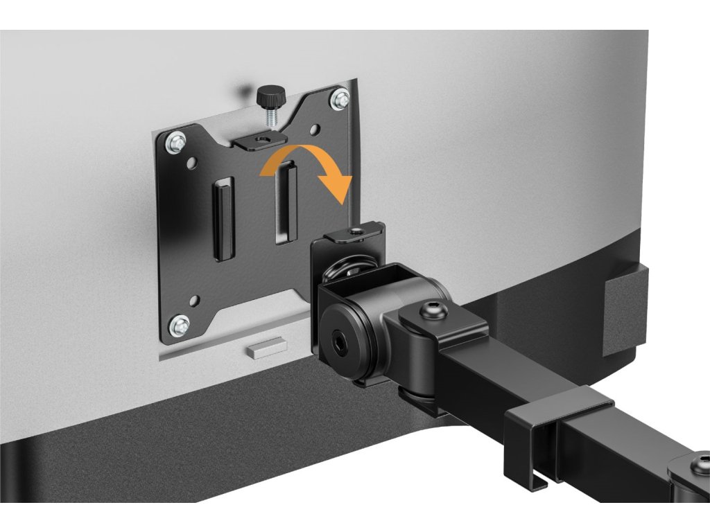 Łatwy montaż ułatwiają odłączane płyty VESA. Po prostu przykręcasz je do monitora, a następnie za pomocą śruby blokującej umieszczasz na ramieniu uchwytu. Regulowany zacisk biurkowy umożliwia instalację nawet na grubszych blatach stołów. Solidne metalowe elementy zapewniają wysoką stabilność i bezpieczeństwo nawet przy stosowaniu z dużymi, 32-calowymi monitorami.