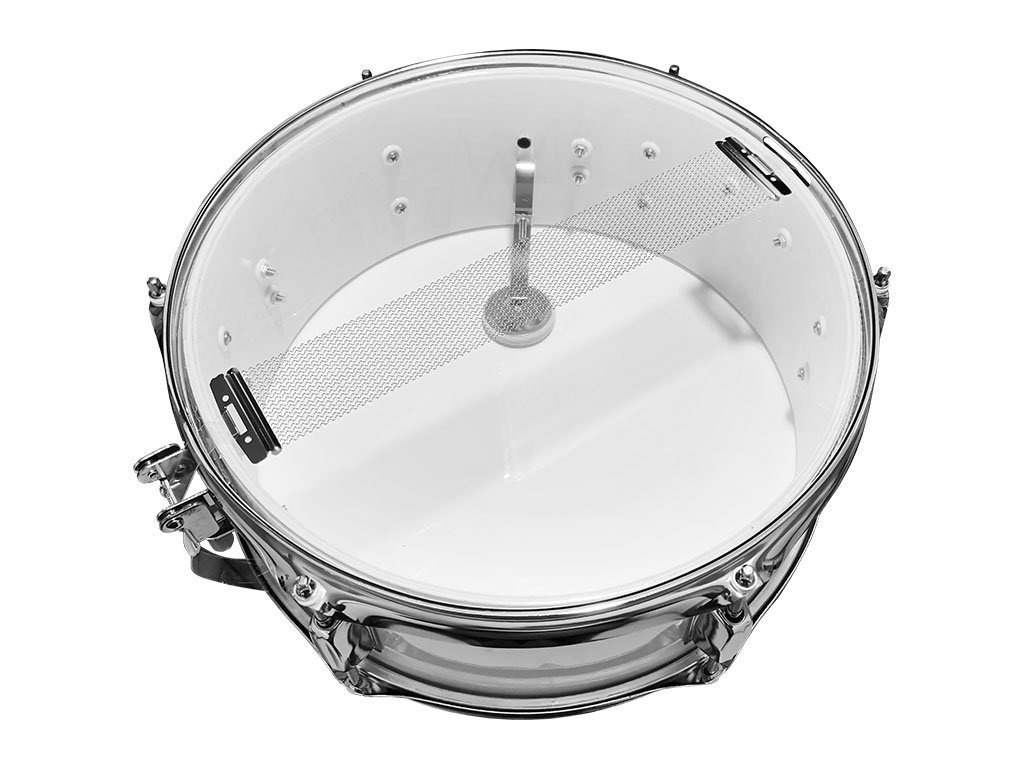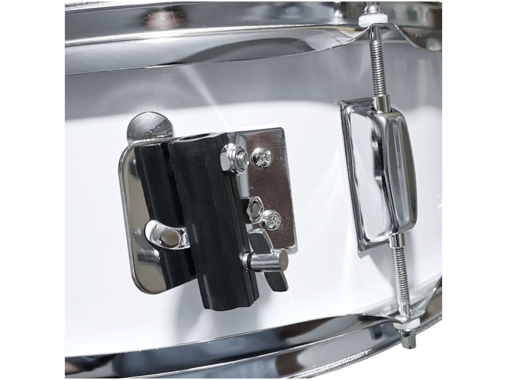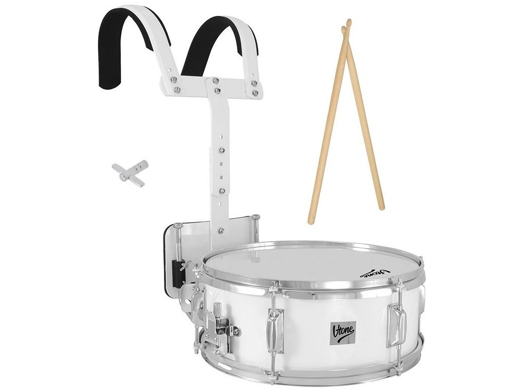 V-TONE MSD 14 to wysokiej jakości marszowy bęben werblowy ("virbl") zawieszony na ramionach i oparty na brzuchu, wyposażony w dwie pałeczki i klucz do regulacji naprężenia membrany. Bęben idealnie nadaje się dla orkiestr dętych, parad wojskowych, pochodów, procesji, ale także dla zespołów weselnych i artystów ulicznych. Wygodna konstrukcja ramy nośnej umożliwia wielopunktową regulację wysokości bębna oraz płynną regulację kąta nachylenia. Pasy na ramiona i podparcie brzucha są pokryte miękkim materiałem, dzięki czemu nie powodują nadmiernego ucisku i zapewniają komfort podczas gry. Odpowiednia średnica i głębokość bębna gwarantują krótki i czysty dźwięk, a sprężyny umieszczone pod nim nadają mu charakterystyczny rezonans. Na uwagę zasługuje również uniwersalne białe wykończenie z czarnymi elementami i chromowane okucia.