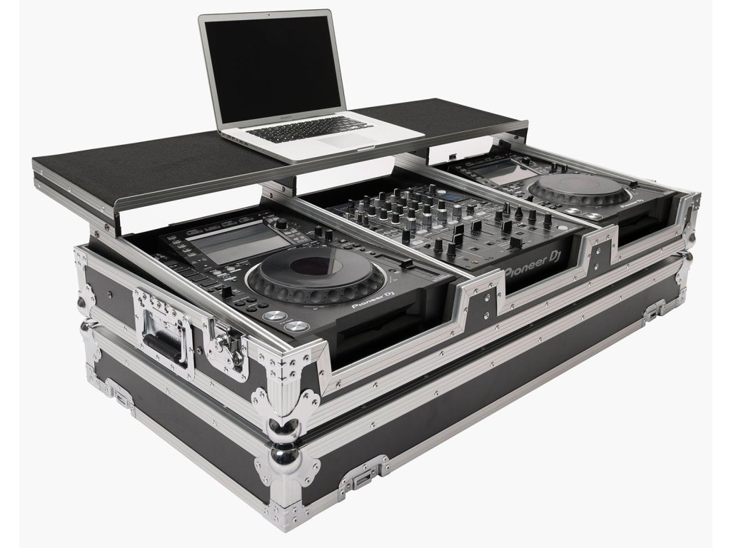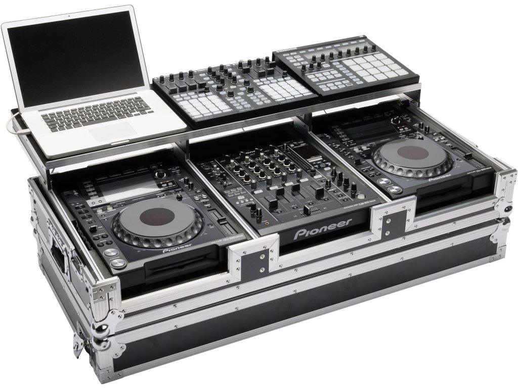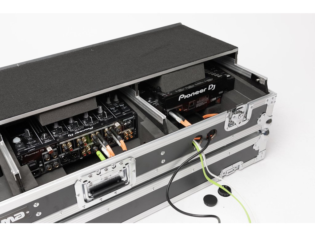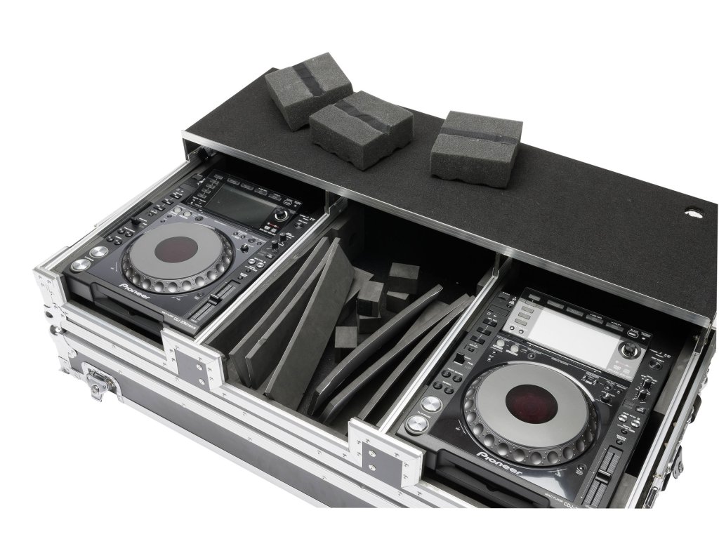 Jeden rozmiar dla wszystkich! Zaprojektowany na miarę dla mobilnych DJ-ów, aby pomieścić dwa CDJ-e lub odtwarzacze multimedialne i jeden czterokanałowy klubowy mikser. Każda przegroda na odtwarzacz CD i mikser jest wyposażona w dodatkowe listwy piankowe, które zapewniają uniwersalne dopasowanie wszystkich modeli Pioneer DJ, Denon, Allen & Heath, Denon, Rane, Reloop itp. Dzięki zdejmowanym osłonom panelu przedniego, użytecznym portom dostępu do kabli i wyjątkowo szerokiej platformie na laptopa, powierzchnia robocza jest gotowa do akcji w mgnieniu oka, ponieważ nie trzeba już wyjmować sprzętu z walizki. Ta walizka, wykonana z laminowanej winylem sklejki o grubości 9 mm, solidnych profili aluminiowych, wytrzymałych zatrzasków motylkowych i gładko jeżdżących kółek, zapewnia doskonałą ochronę podczas mobilnego użytkowania w podróży.