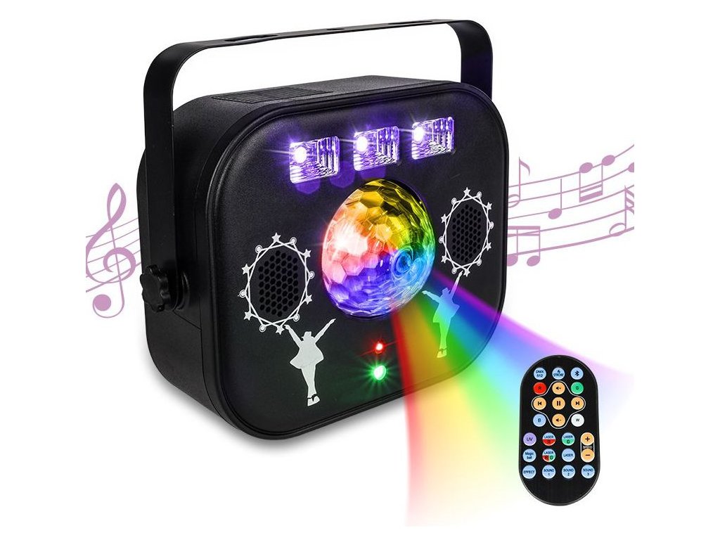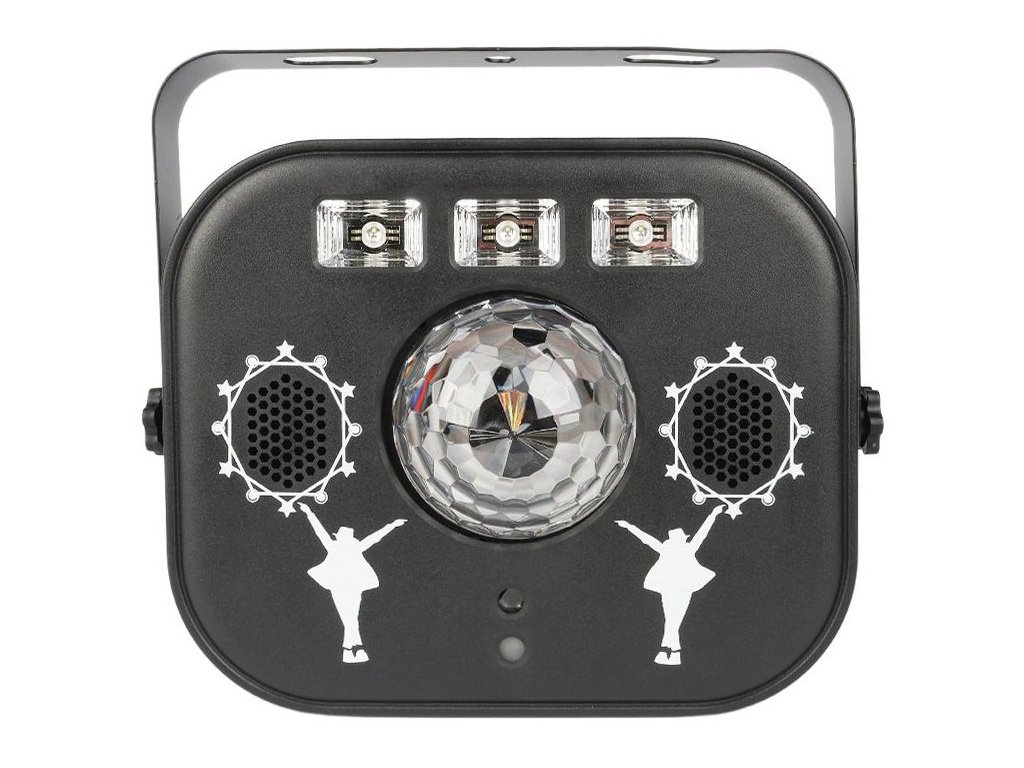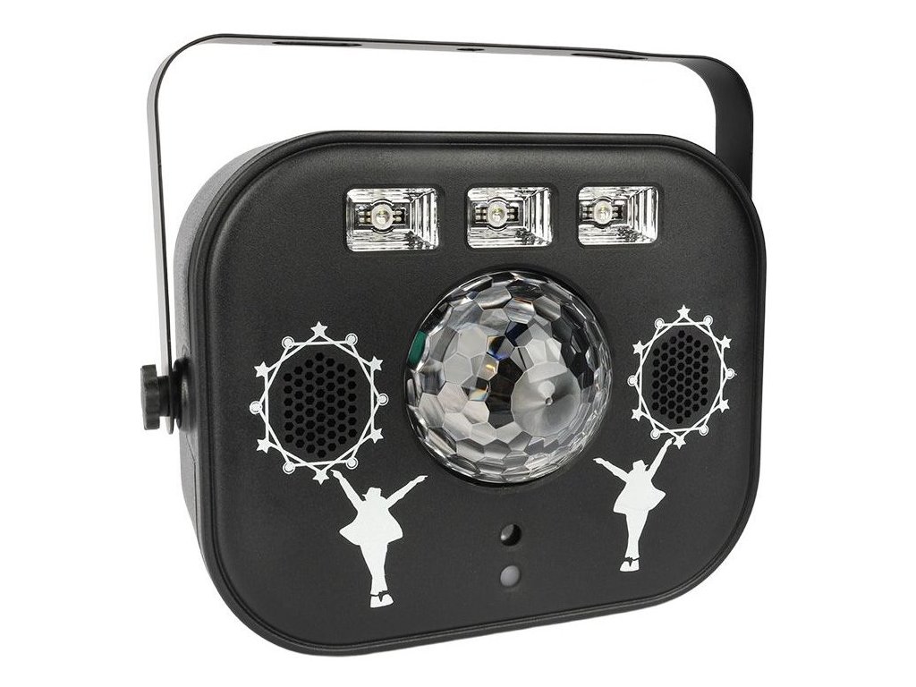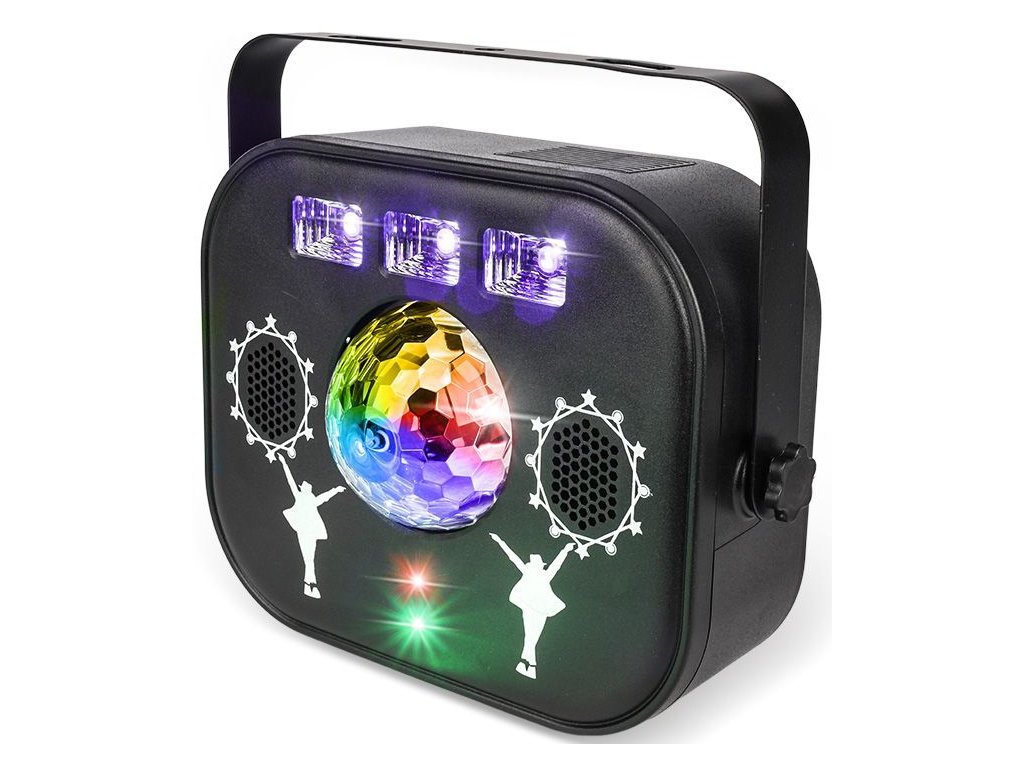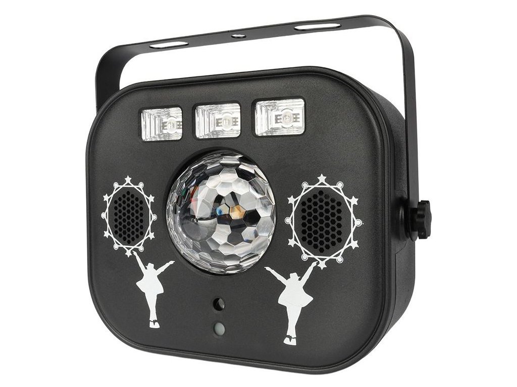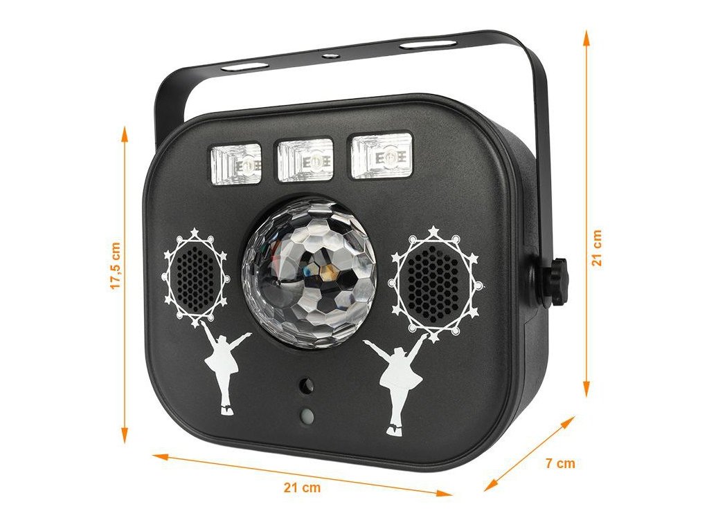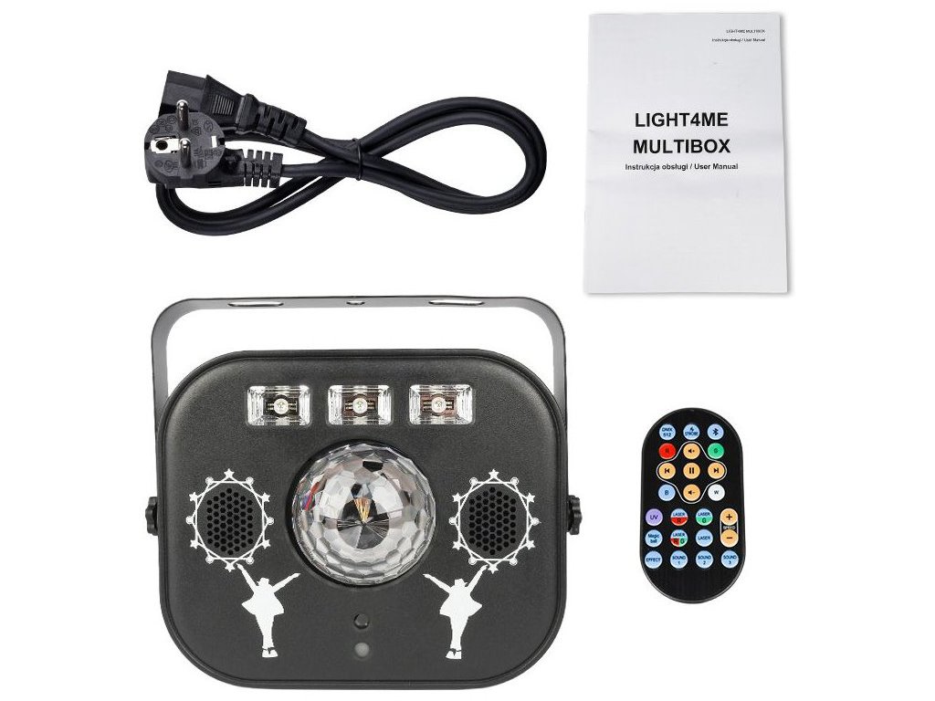LIGHT4ME Multibox jest wyposażony w efekt kuli disco, której prędkość można regulować, aby zapewnić spektakularny pokaz świetlny. Kolejnym efektem jest czerwony i zielony laser, który emituje imponujące, ruchome wiązki. Dynamikę oświetlenia zwiększa również wbudowany stroboskop, którego częstotliwość można płynnie regulować. Dodatkową unikalną cechą tego efektu LED jest możliwość uzyskania światła ultrafioletowego, a także kilka różnych ustawień dźwięku i trybu automatycznego, co oznacza, że multiefekt może działać bez konieczności ręcznego sterowania. Dzięki kompaktowej obudowie z uchwytem montażowym efekt ten można łatwo zainstalować w dowolnym miejscu. Bezprzewodowy pilot zdalnego sterowania ułatwia sterowanie na odległość.