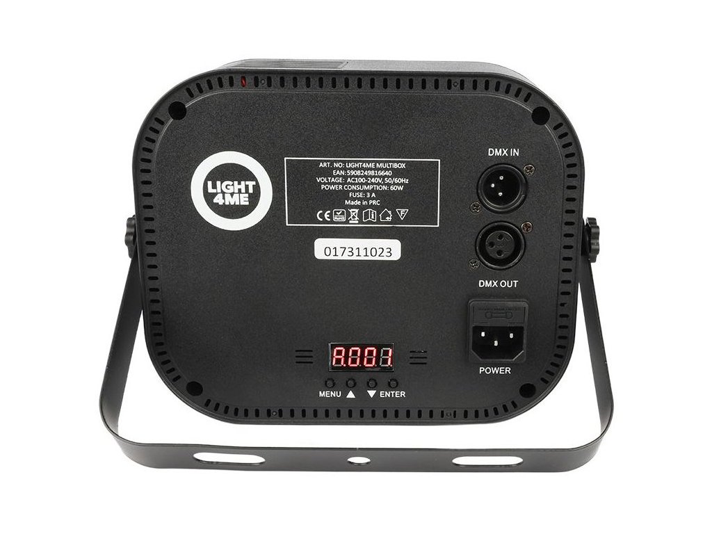 Efekt Light4Me Multibox to efekt świetlny, który dzięki kompaktowej obudowie z uchwytem montażowym można łatwo zainstalować w dowolnym miejscu. Łatwe zdalne sterowanie zapewnia bezprzewodowy pilot zdalnego sterowania. Z tyłu urządzenia znajduje się 3-pinowe wejście i wyjście XLR do sterowania efektem LED za pośrednictwem protokołu DMX oraz panel sterowania składający się z cyfrowego wyświetlacza i 4 przycisków. Za ich pomocą możemy zmieniać ustawienia w menu, a także wybrać jeden z czterech trybów pracy: