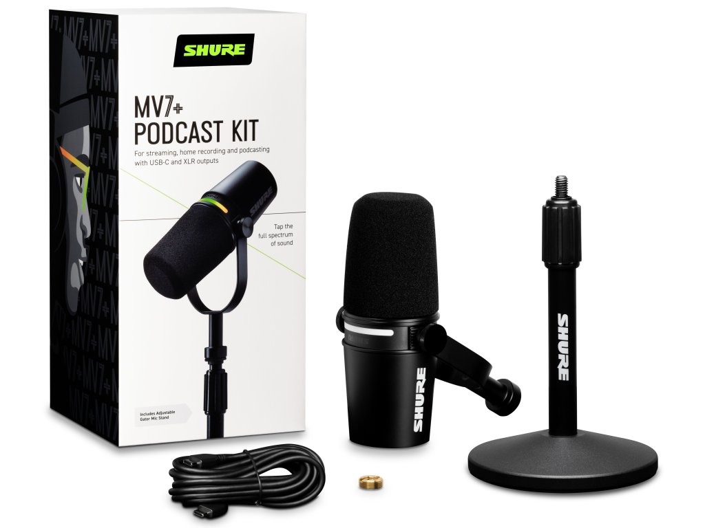 - Zawartość opakowania: Mikrofon MV7+, kabel USB-C/USB-C 3m, statyw stołowy, skrócona instrukcja obsługi