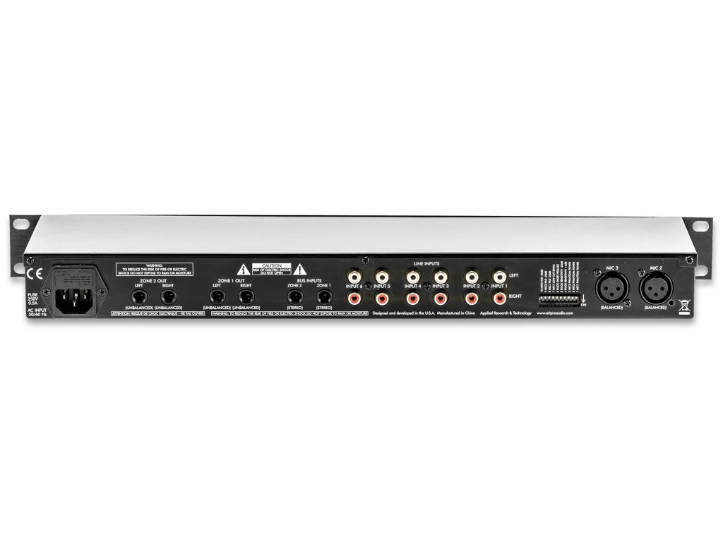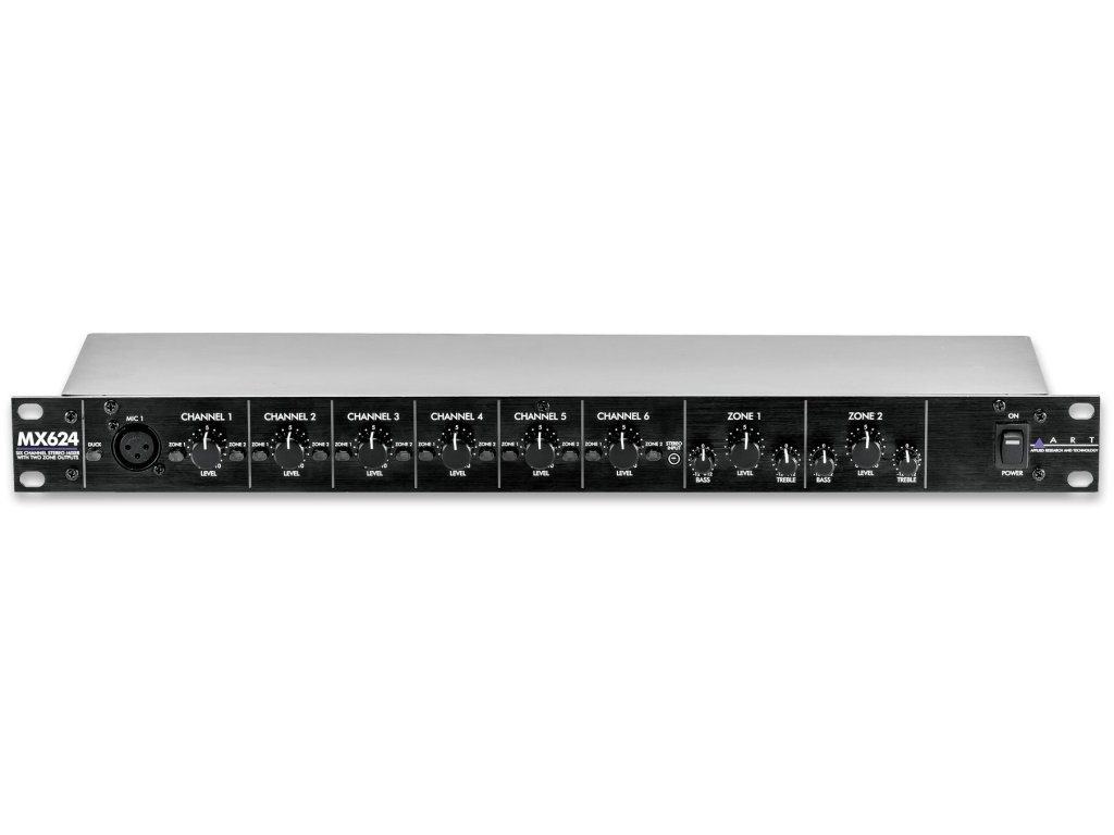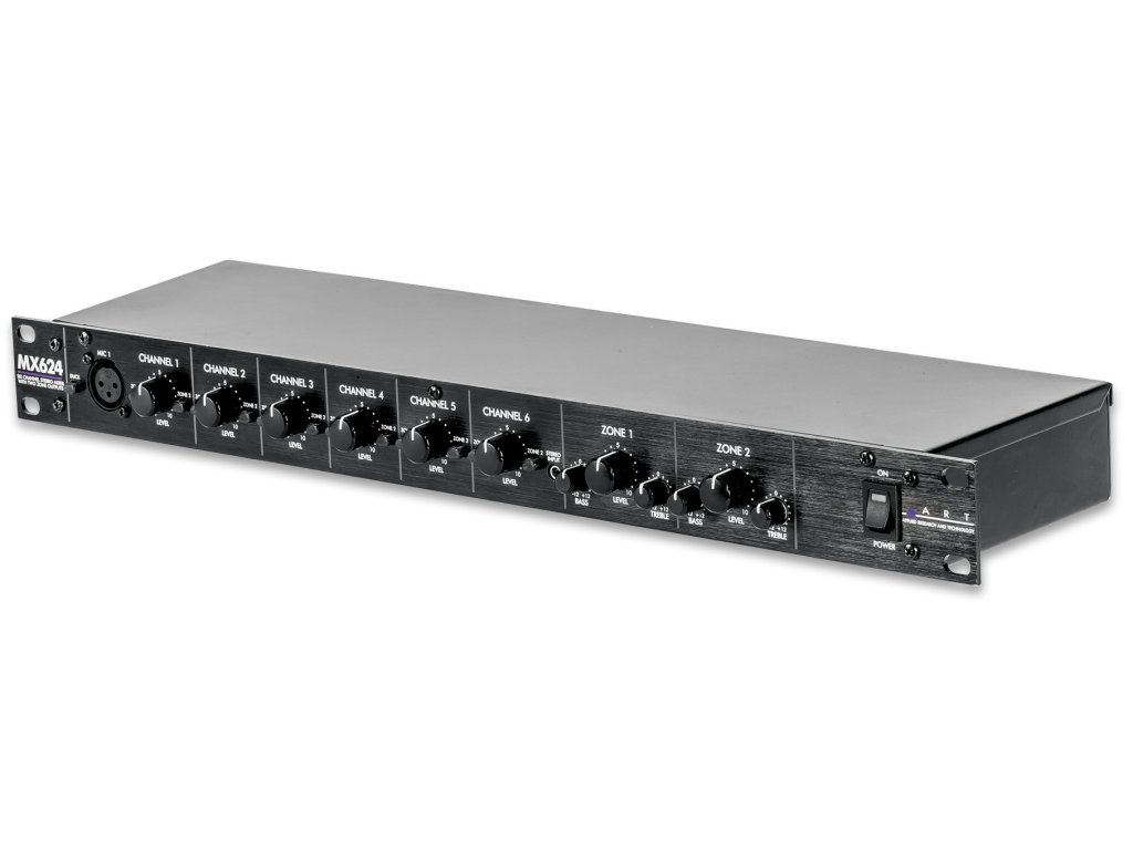 Wszechstronny 6-kanałowy mikser rackowy z dwustrefowym wyjściem. Niezależne sterowanie poziomem (level), basami (bass) i sopranami (treble) dla każdej strefy. Nadaje się do występów na żywo, do studia lub na konferencje i prezentacje. Można go zasilać za pomocą zasilania fantomowego 48 V i zamontować w szafie rack. Podłącza się go za pomocą złączy XLR, 6,3 mm jack lub RCA. Impedancja: 200 Ohm. Pasmo przenoszenia: 20 Hz - 20 kHz. Wymiary: 44,5 x 483 x 152 mm. Waga: 2,2 kg.
