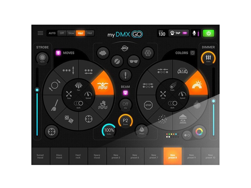 Aplikacja myDMX GO nie wymaga programowania i może być używana do tworzenia oszałamiających, zsynchronizowanych pokazów świetlnych na dowolnej kombinacji opraw oświetleniowych. Charakterystyczna konstrukcja urządzenia zawiera dwa pokrętła sterujące efektami specjalnymi – jedno dla sekwencji kolorowych chase i jedno dla wzorów ruchu – zawierające osiem zaprogramowanych efektów (na każdym pokrętle). Efekty można niezależnie wybierać, modyfikować (zmieniając paletę kolorów, prędkość, rozmiar, przesunięcie i rozproszenie) i łączyć, tworząc ogromną liczbę różnych, unikalnych efektów, które można zapisywać w celu natychmiastowego załadowania do jednego z 50 zdefiniowanych przez użytkownika ustawień wstępnych. W ciągu kilku sekund można stworzyć niesamowite pokazy świetlne, które w przypadku korzystania z tradycyjnych systemów sterowania wymagałyby godzin programowania.