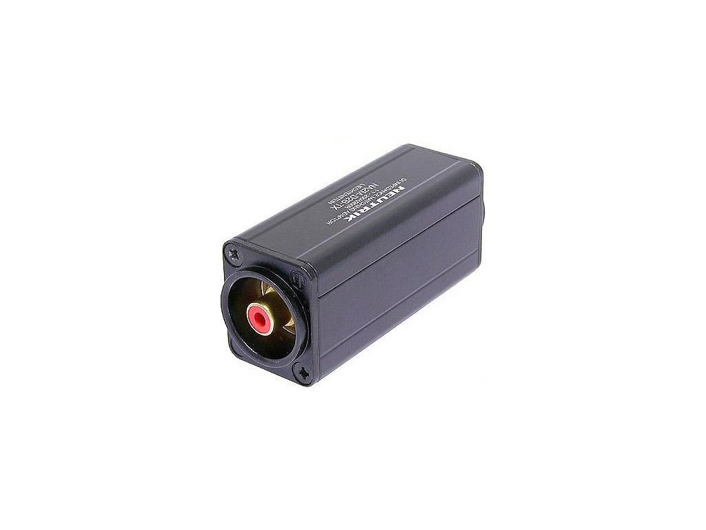 Miniaturowy transformator/adapter symetryzujący, 3-pinowe złącze XLR męskie - gniazdo RCA / phono, kodowanie kolorem czerwonym.
