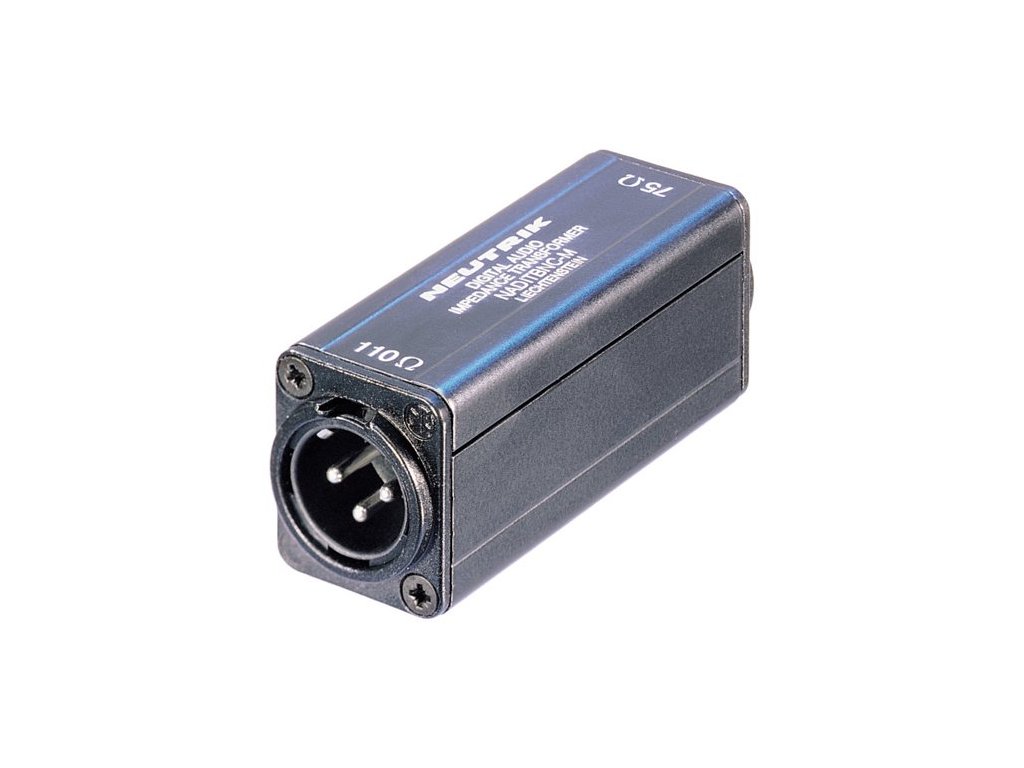 Adapter impedancji, złącze żeńskie BNC 75 Ω wejście – panelowe złącze męskie XLR 110 Ω wyjście. Interfejs dla zbalansowanych i koncentrycznych linii.