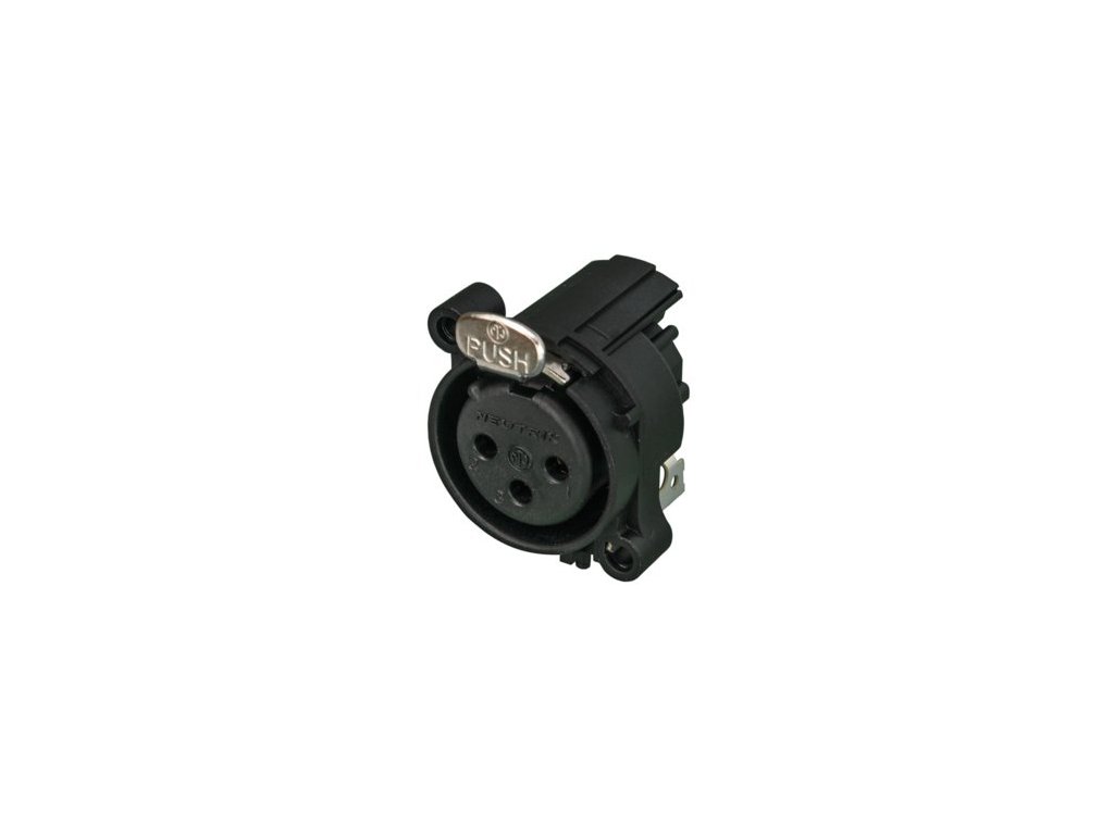 Panelowe 3-pinowe gniazdo XLR, żeńskie. Uziemienie: obudowa przeciwległego złącza na pin 1 i panel przedni. Plastikowa obudowa, wersja z zatrzaskiem, montaż poziomy do PCB.