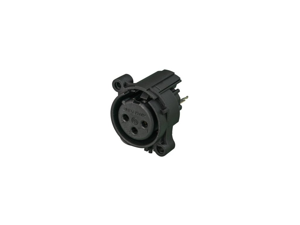 Panelowe 3-pinowe gniazdo XLR, żeńskie, bez uziemienia. Plastikowa obudowa, wykonanie ze sprężyną przytrzymującą zamiast zatrzasku, pionowy montaż do PCB.