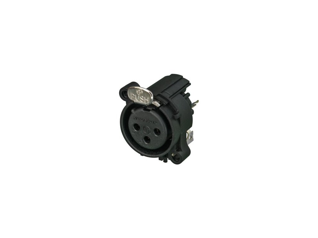 Panelowe 3-pinowe gniazdo XLR, żeńskie. Uziemienie: oddzielny styk z obudową wtyczki i panelem przednim. Plastikowa obudowa, wersja z zatrzaskiem, montaż pionowy do PCB.