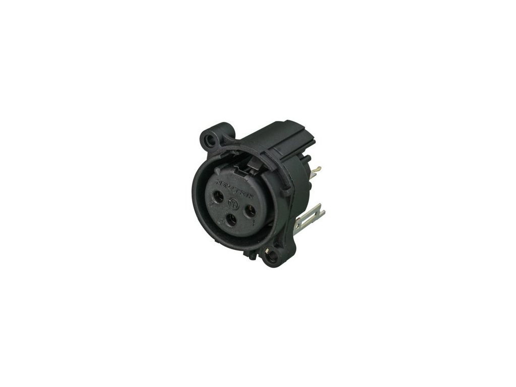 Panelowe 3-pinowe gniazdo XLR, żeńskie. Uziemienie: oddzielny styk uziemiający na obudowie przeciwległego złącza i panelu przedniego. Plastikowa obudowa, wykonanie ze sprężyną przytrzymującą zamiast zatrzasku, pionowy montaż do PCB.