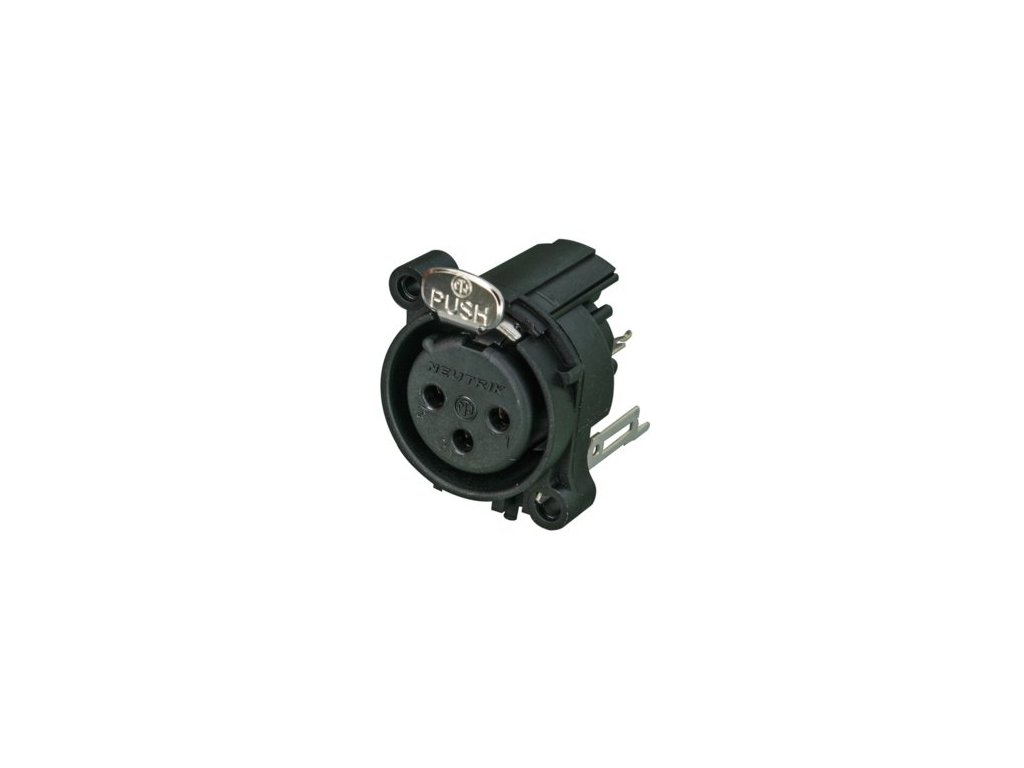 Panelowe 3-pinowe gniazdo XLR, żeńskie. Uziemienie: oddzielny styk uziemiający na obudowie przeciwległego złącza i panelu przedniego. Plastikowa obudowa, wersja z zatrzaskiem, montaż pionowy do PCB.
