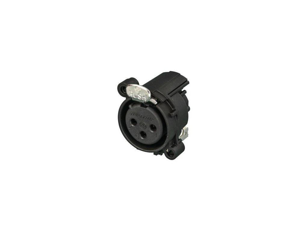 Panelowe 3-pinowe gniazdo XLR, żeńskie. Uziemienie: obudowa przeciwległego złącza na pin 1 i panel przedni. Plastikowa obudowa, wersja z zatrzaskiem, montaż poziomy do PCB.