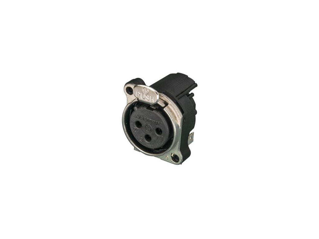Panelowe 3-pinowe gniazdo XLR, żeńskie. Uziemienie: oddzielny styk uziemiający na obudowie przeciwległego złącza i panelu przedniego. Plastikowy korpus z metalowym kołnierzem, wersja z zatrzaskiem, poziomy montaż do PCB.