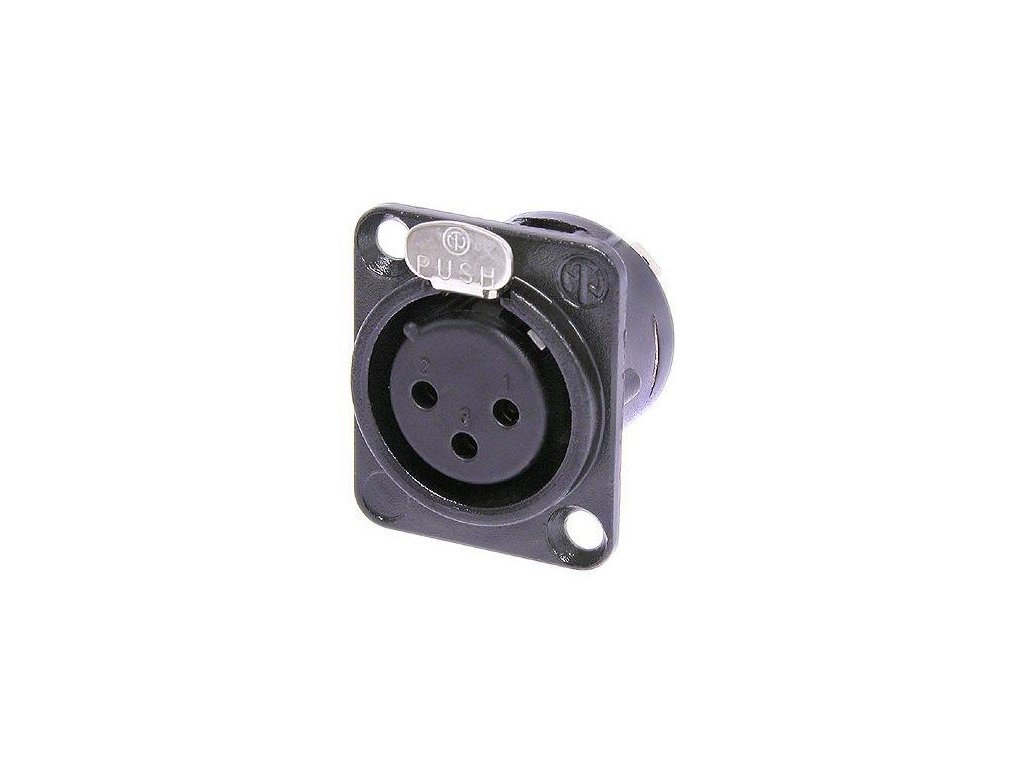 Panelowe 3-pinowe gniazdo XLR, żeńskie. Metalowa obudowa D-size, pozłacane styki, zaciski lutownicze, kolor czarny.