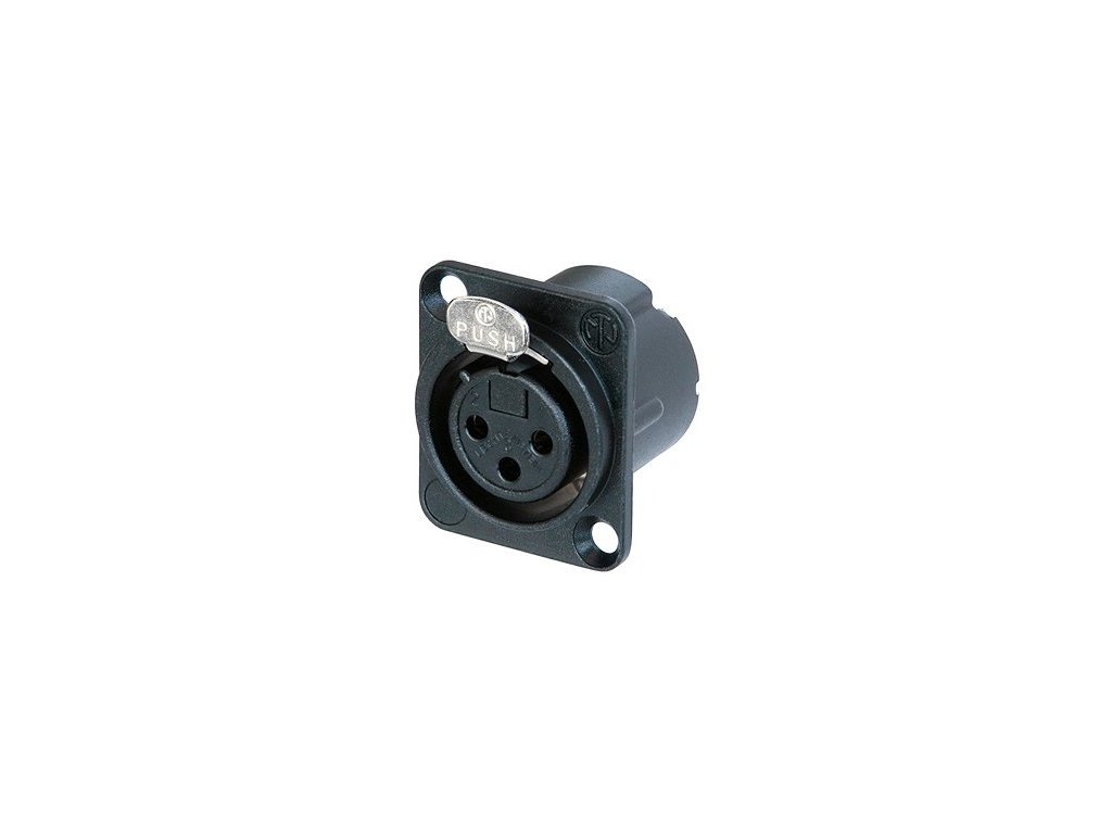 Panelowe 3-pinowe gniazdo XLR, żeńskie. Metalowa obudowa, srebrne styki, zaciskane (standardowy B-krimp), kolor czarny. Wykonanie z zatrzaskiem.
