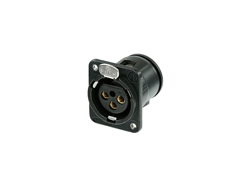 Panelowe 3-pinowe gniazdo XLR, żeńskie. Metalowa obudowa D-size, montaż pionowy do PCB, otwory montażowe M3, pozłacane styki, kolor czarny. Wykonanie z zatrzaskiem.
