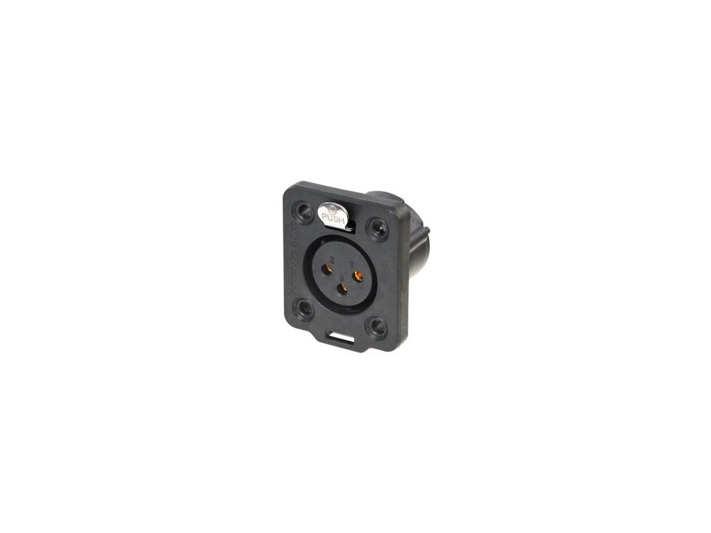 Panelowe 3-pinowe gniazdo XLR, żeńskie. Wytrzymała obudowa z tworzywa sztucznego, do użytku na zewnątrz, pozłacane styki, wersja lutowana. Wykonanie ze stalowym zatrzaskiem.