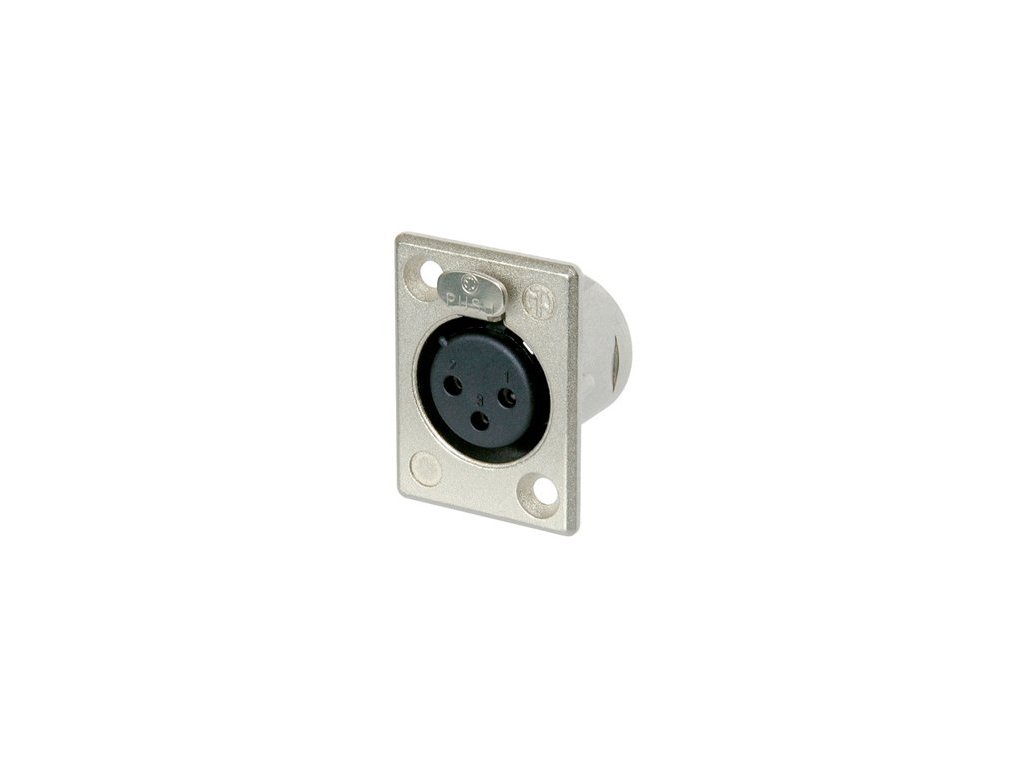 Panelowe 3-pinowe gniazdo XLR, żeńskie. Metalowy korpus, posrebrzane styki, zaciski lutownicze, srebrny kolor. Wersja z zatrzaskiem.