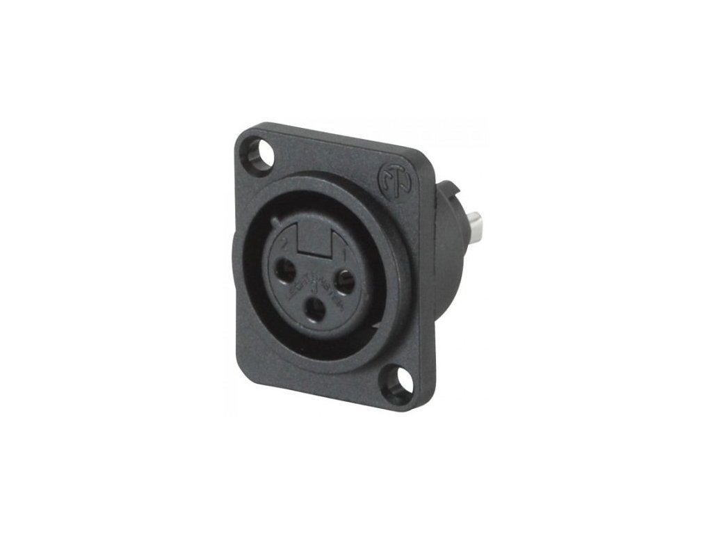 Panelowe 3-pinowe gniazdo XLR, żeńskie. Plastikowa obudowa, posrebrzane styki, kubki lutownicze, czarny kolor. Wersja bez zatrzasku.