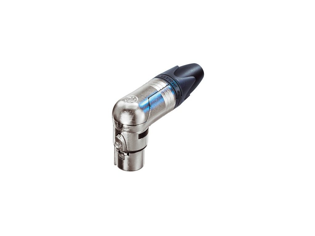 Kątowe 3-pinowe złącze kablowe, żeńskie. Metalowa obudowa, posrebrzane styki, kolor srebrny.