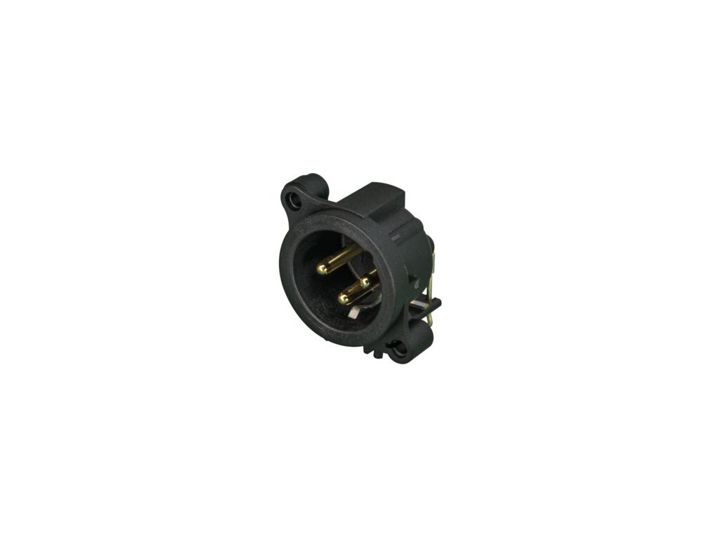 Panelowe 3-pinowe gniazdo XLR, męskie. Uziemienie: styk uziemiający podłączony do uziemienia obudowy, ale nie do panelu przedniego ani PIN 1. Plastikowa obudowa, poziomy montaż na PCB.