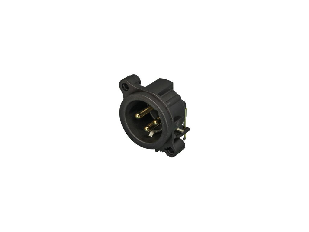 Panelowe 3-pinowe gniazdo XLR, męskie. Uziemienie: styk uziemiający podłączony do uziemienia obudowy, ale nie do panelu przedniego ani PIN 1. Plastikowa obudowa, poziomy montaż na PCB.