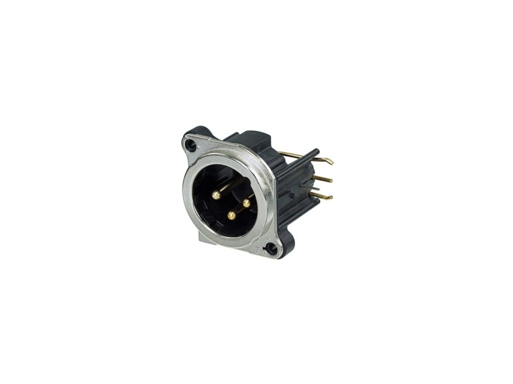 Panelowe 3-pinowe gniazdo XLR, męskie. Uziemienie: oddzielny styk uziemiający na obudowie wtyczki i panelu przednim. Plastikowy korpus z metalowym kołnierzem, prawy montaż boczny na PCB.